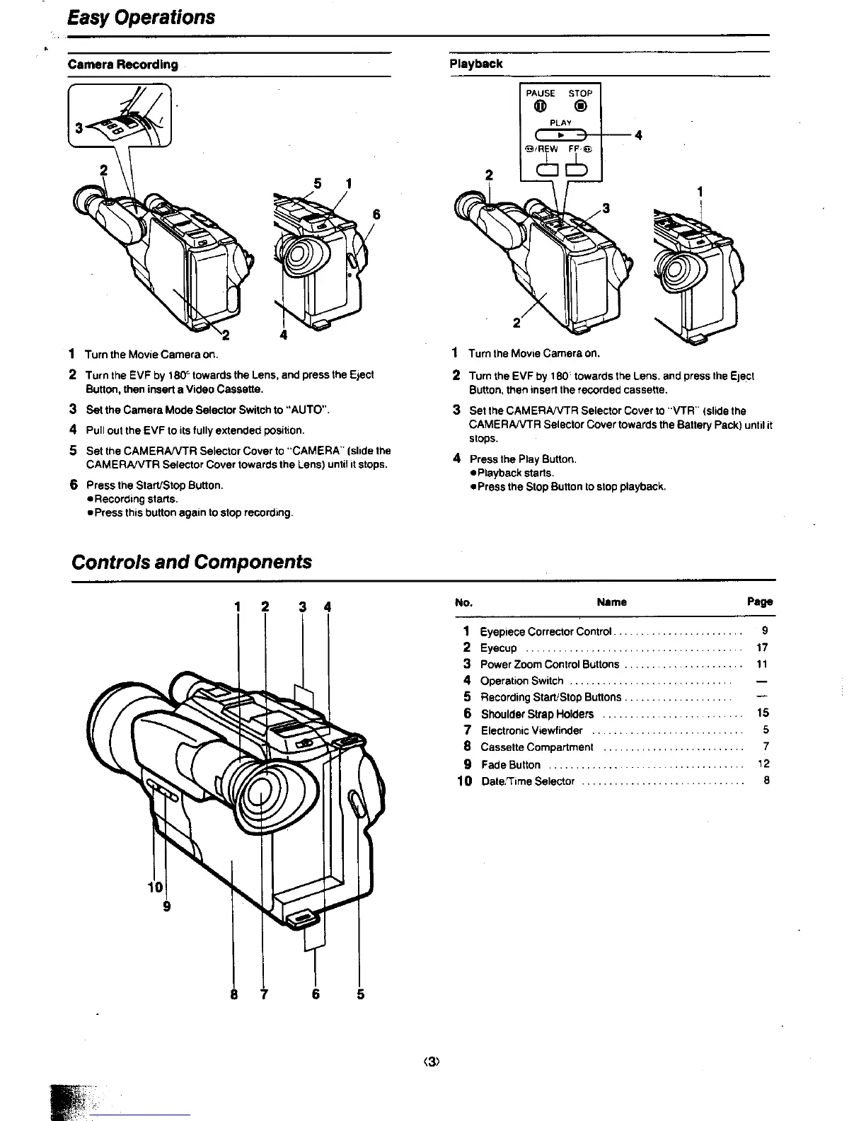 Panasonic NV-G101 - Easy Operations; Camera Recording Setup; Playback Initiation; Camcorder Controls and Components