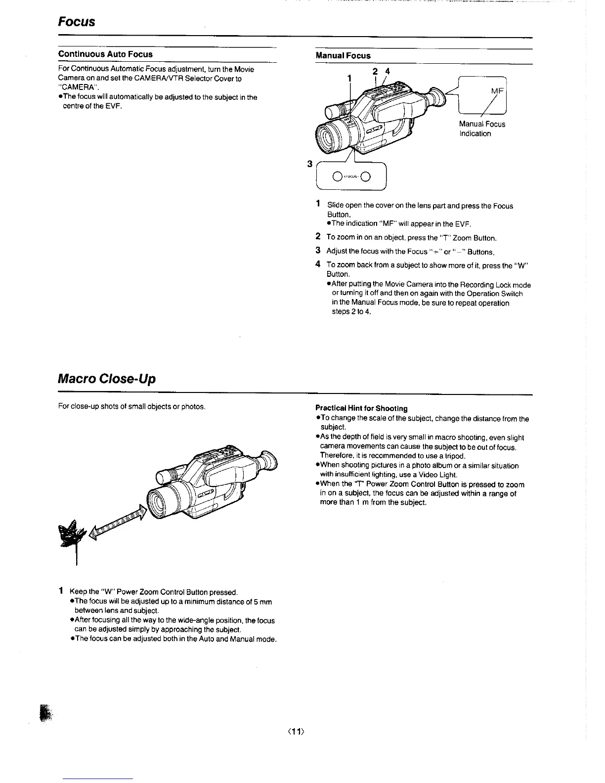 Panasonic NV-G3A - Focus Adjustment Methods; Continuous Auto Focus Operation; Manual Focus Adjustment; Macro Shooting Guide