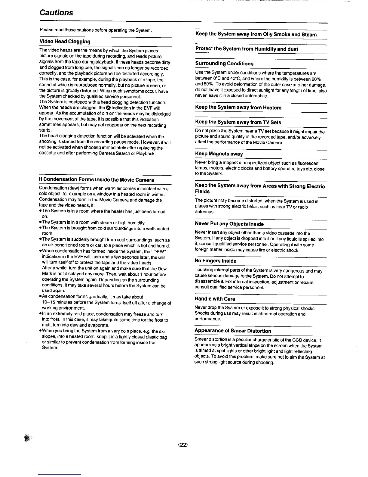 Panasonic NV-G3A - General Cautions and Warnings; Video Head Clogging Issues; Condensation and Environmental Precautions; System Handling and Protection
