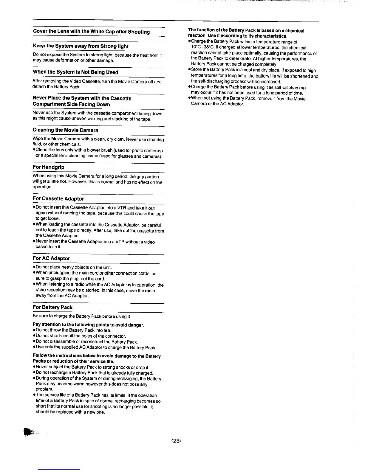 Panasonic NV-G3A - Further Cautions and Maintenance; Lens Protection and Storage; Adaptor and Battery Pack Precautions