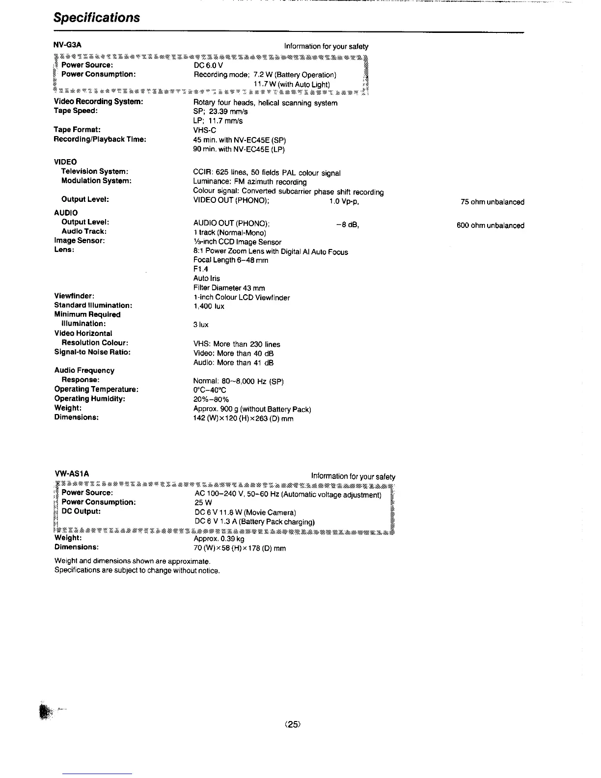 Panasonic NV-G3A - Technical Specifications; NV-G3 A Camera Specifications; VW-AS1 A AC Adaptor Specifications