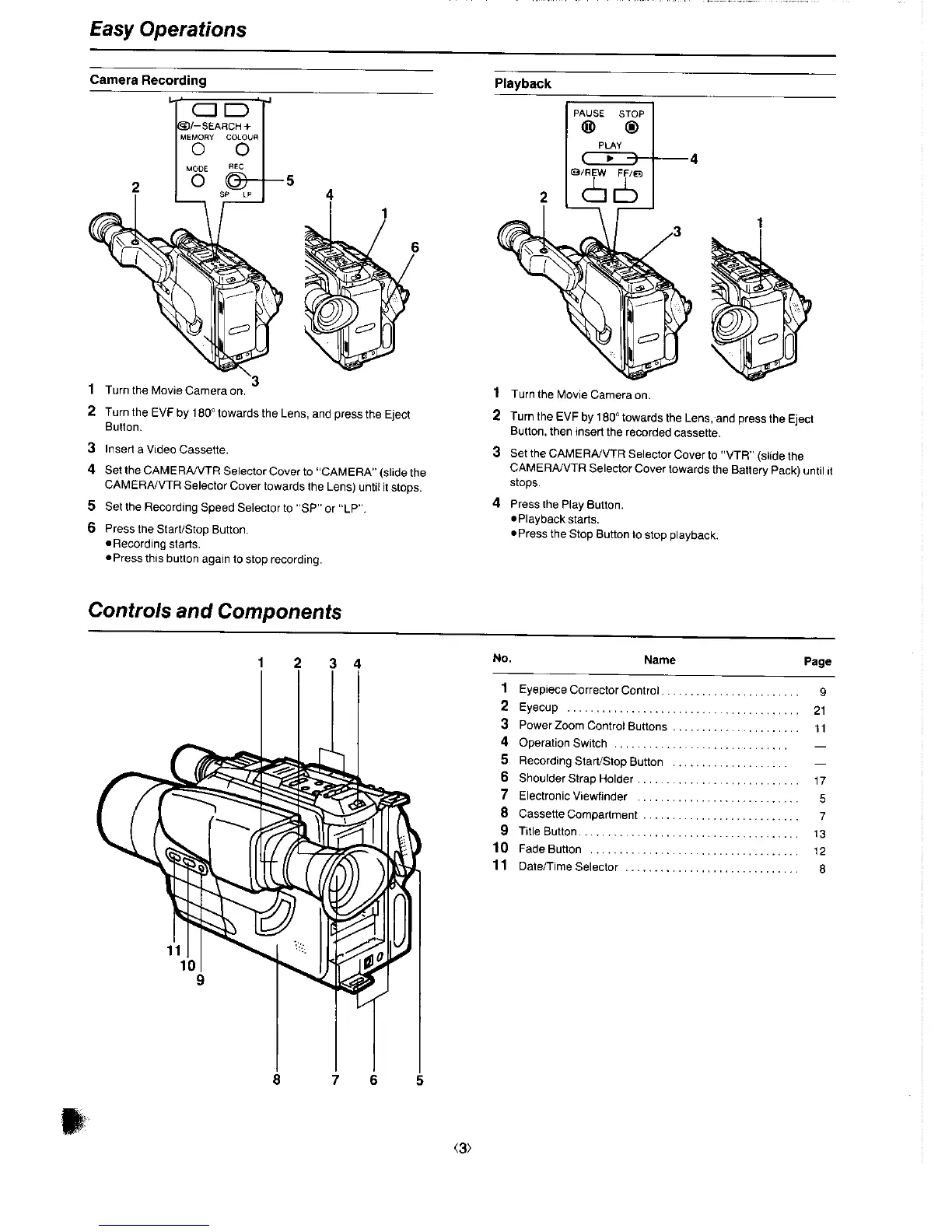 Panasonic NV-G3A - Easy Operations; Camera Recording Steps; Playback Operations; Controls and Components Overview