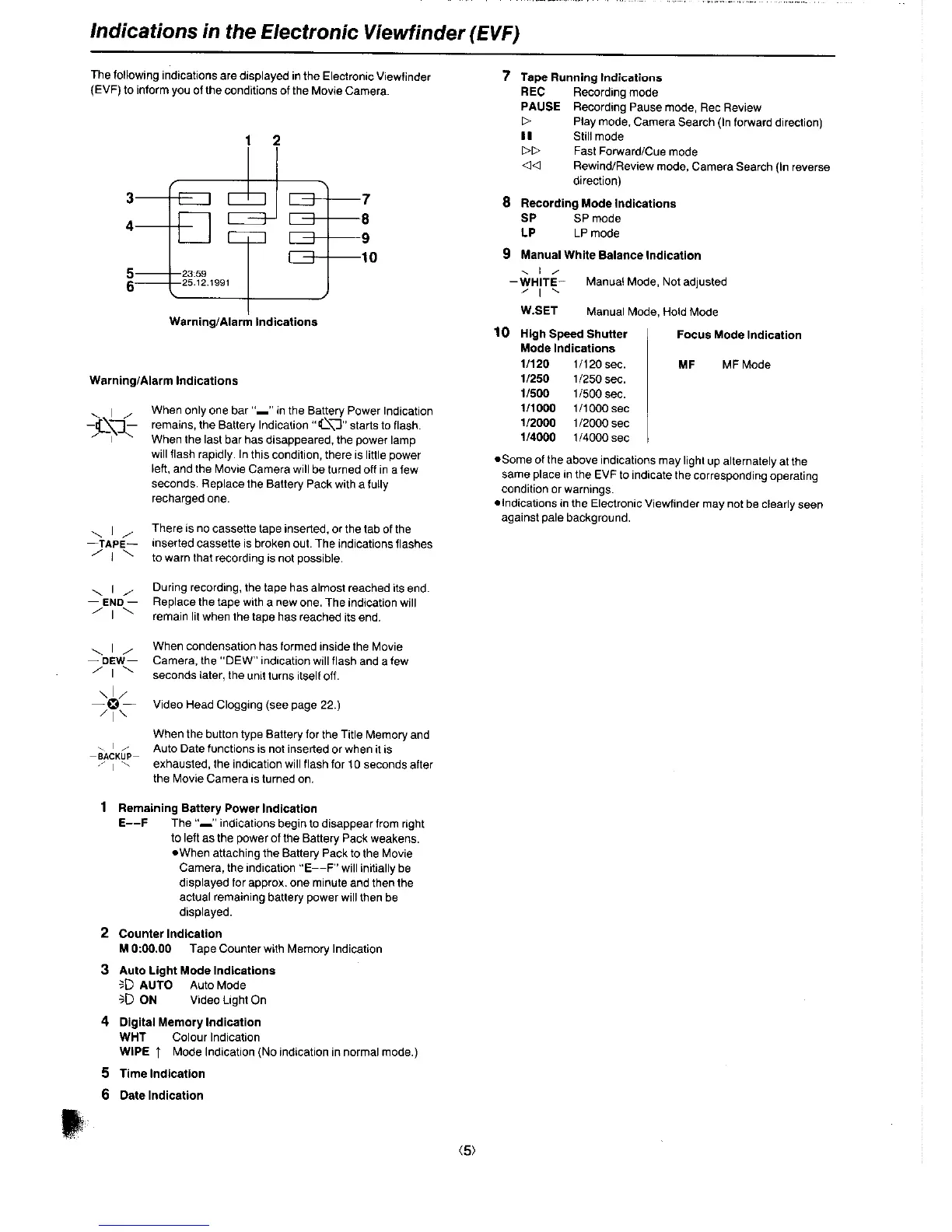 Panasonic NV-G3A - Electronic Viewfinder (EVF) Indications; Warning and Alarm Symbols; Tape Status and Mode Indicators; Shutter Speed and Focus Indicators