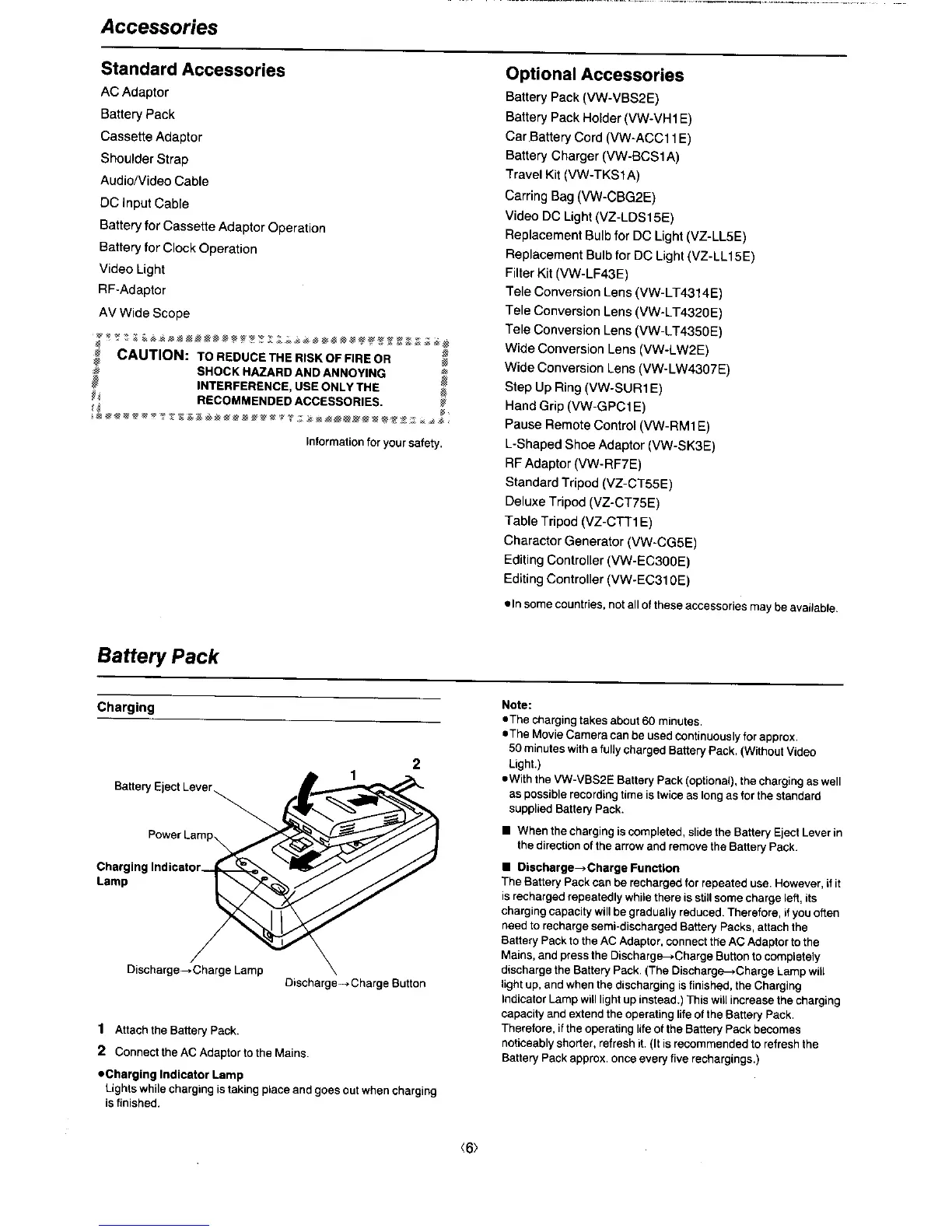 Panasonic NV-G3A - Camera Accessories; Standard Included Accessories; Optional Accessories List; Battery Pack Management