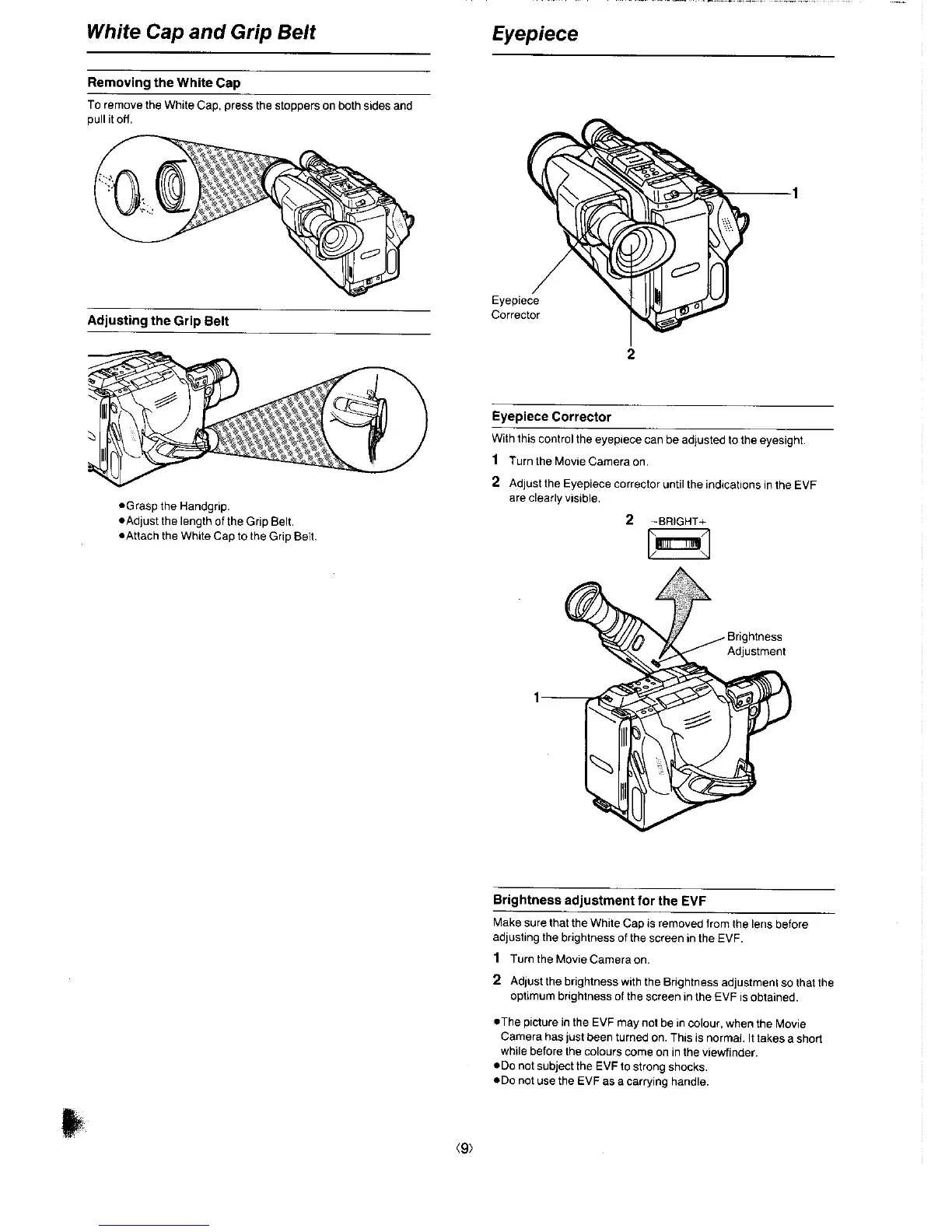 Panasonic NV-G3A - Camera Exterior Features; White Cap and Grip Belt Handling; Eyepiece Adjustment and EVF Brightness