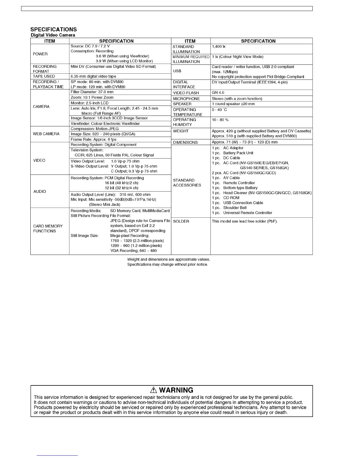 NV-GS150E / NV-GS150EG / NV-GS150EB / NV-GS150EP / NV-GS150GC / NV-GS150GN / NV-GS150GCD / NV-GS140E / NV-GS140EG / NV-GS140EB / NV-GS140EP / NV-GS158GK