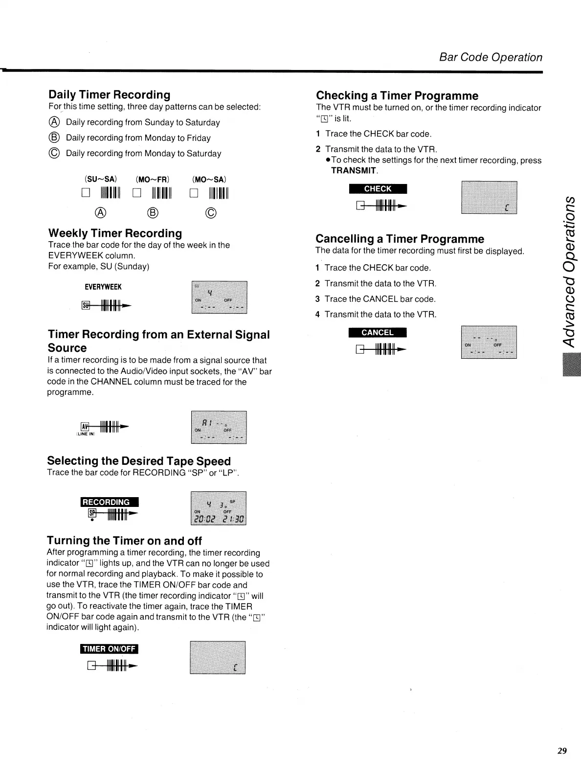 use the VTR, trace the TIMER ON/OFF bar code and