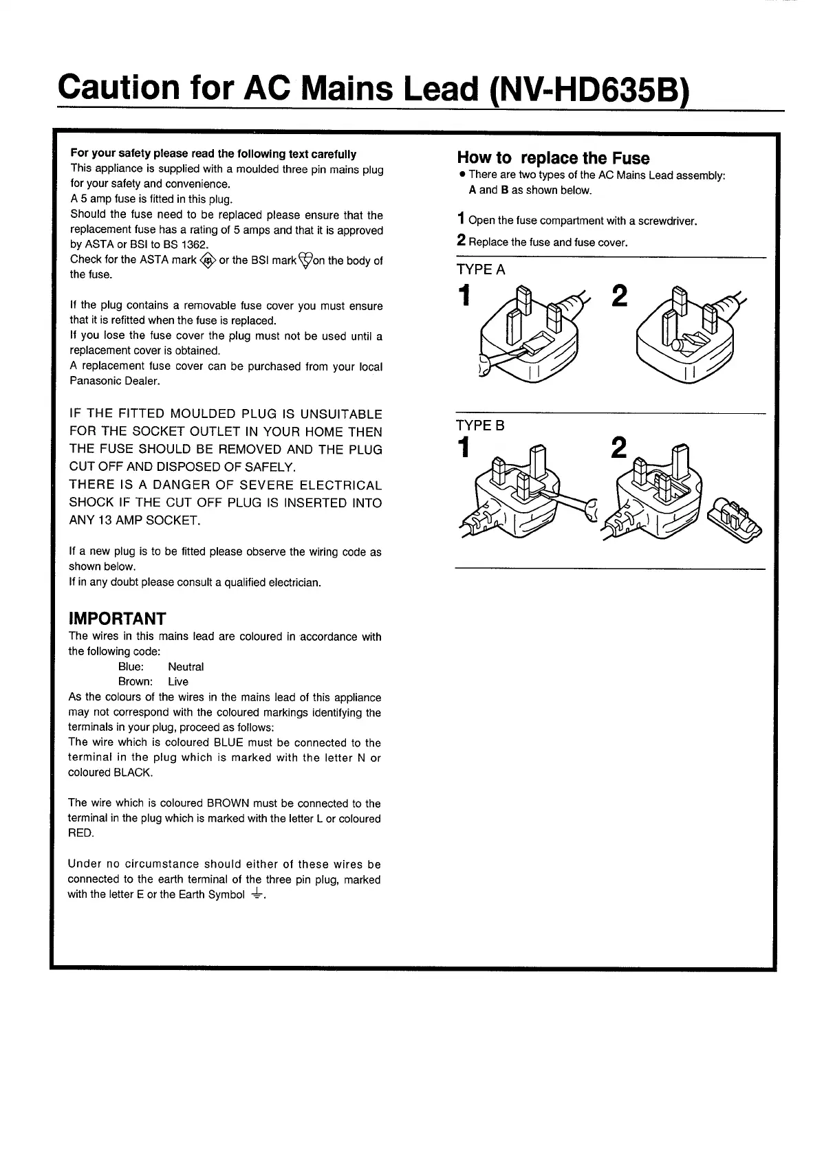 Panasonic NV-HD635 - Caution for AC Mains Lead; How to Replace the Fuse