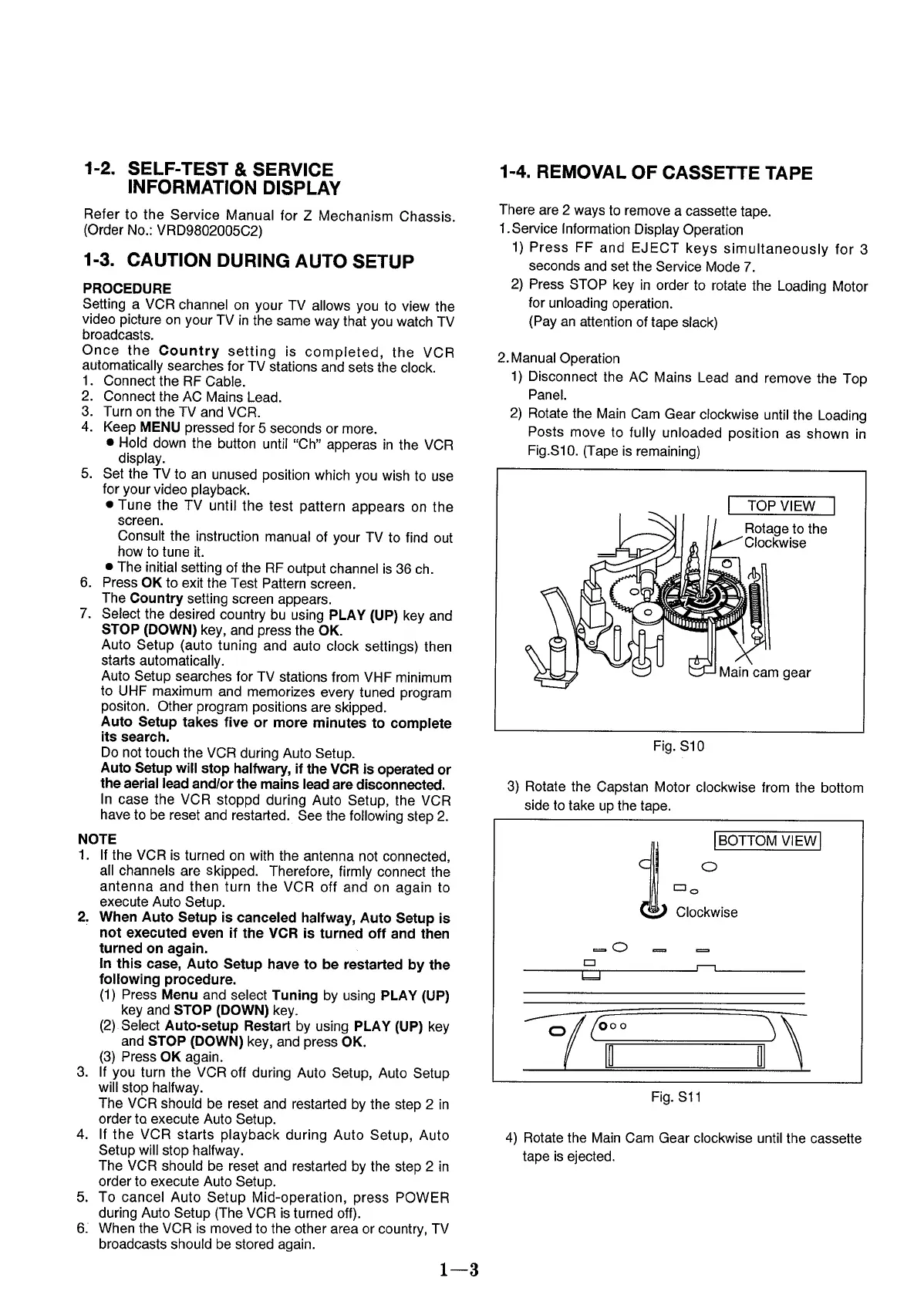 Panasonic NV-HD635 - Self-Test & Service Information Display; Caution During Auto Setup; Removal of Cassette Tape
