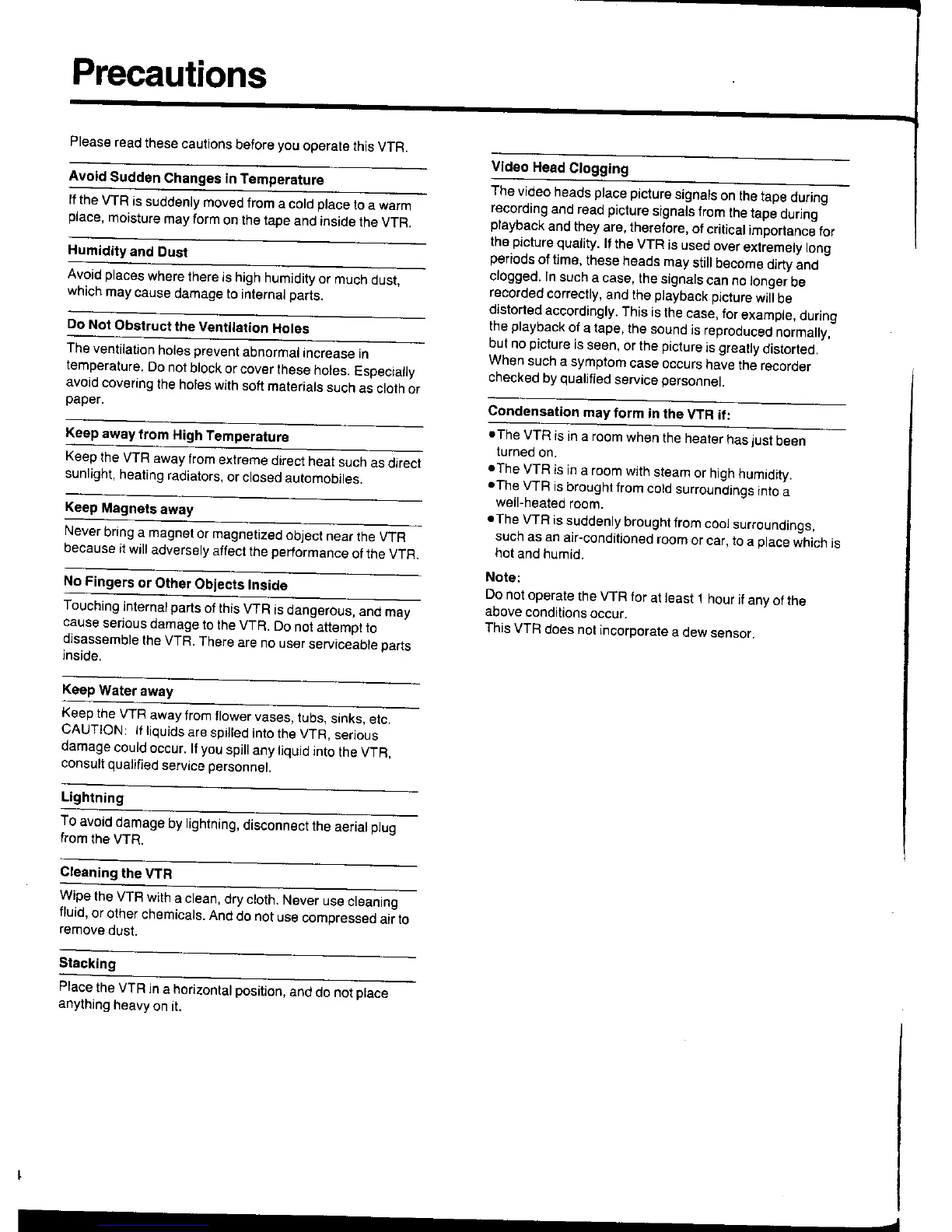 Panasonic NV-HS1000EC - General Precautions and Care; Environmental Precautions; Handling and Maintenance Precautions; Troubleshooting Condensation and Head Clogging