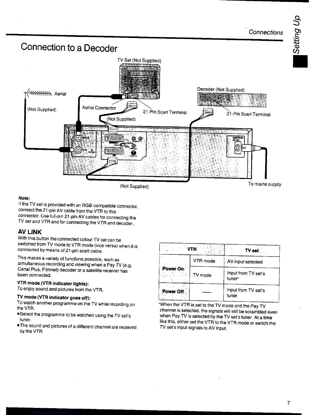 Panasonic NV-HS1000EC - Connecting to External Devices; Decoder Connection and AV LINK; VTR and TV Modes Explained