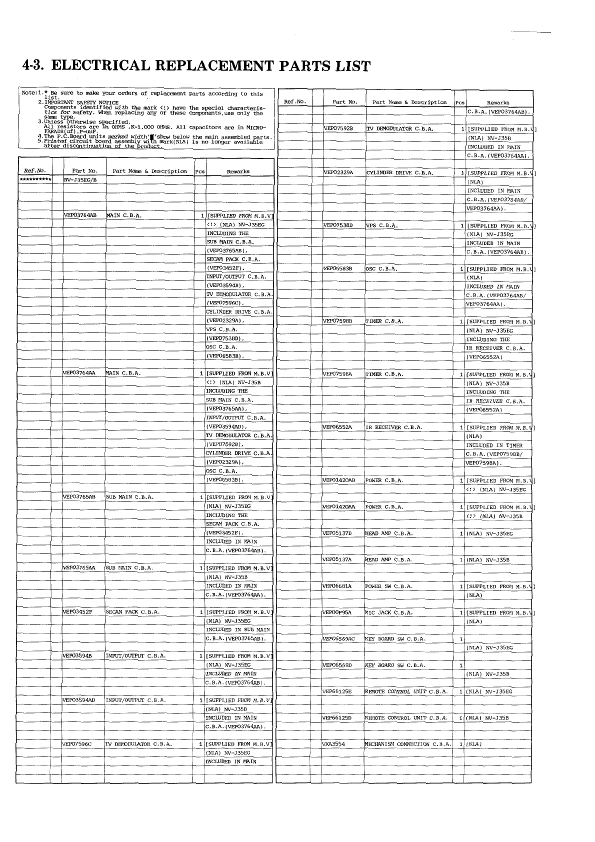 Panasonic NV-J35 - Electrical Parts Replacement List