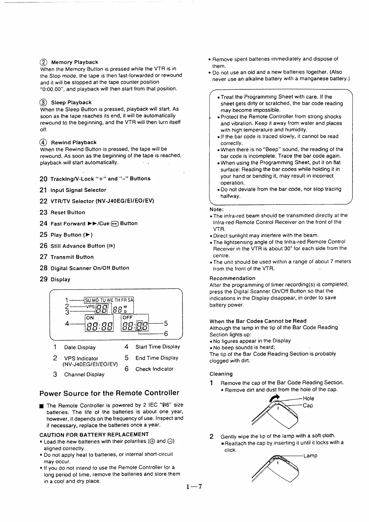 Panasonic NV-J40 - Power Source for the Remote Controller; When the Bar Codes Cannot be Read; Cleaning