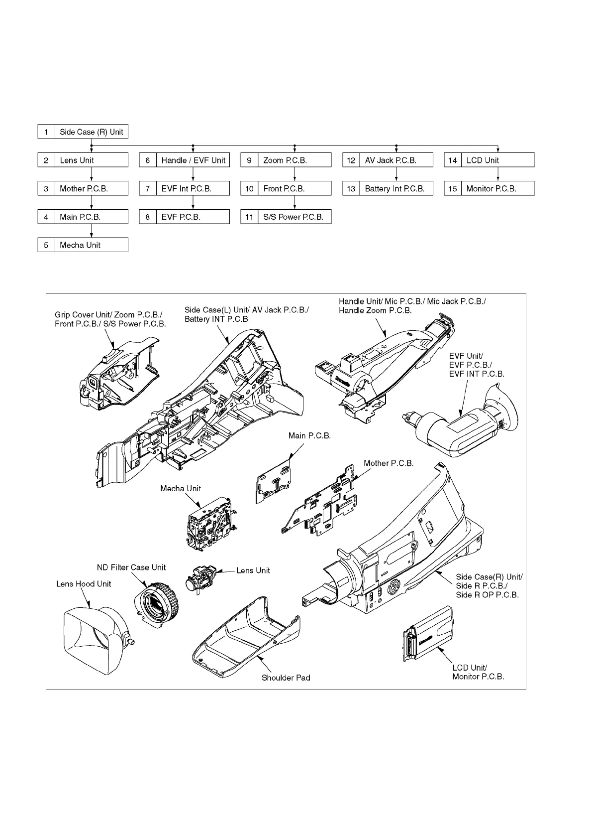 This flow chart indicates the disassembly steps the cabinet parts, P.C.B. and Mecha. Unit in order to access to be serviced. When