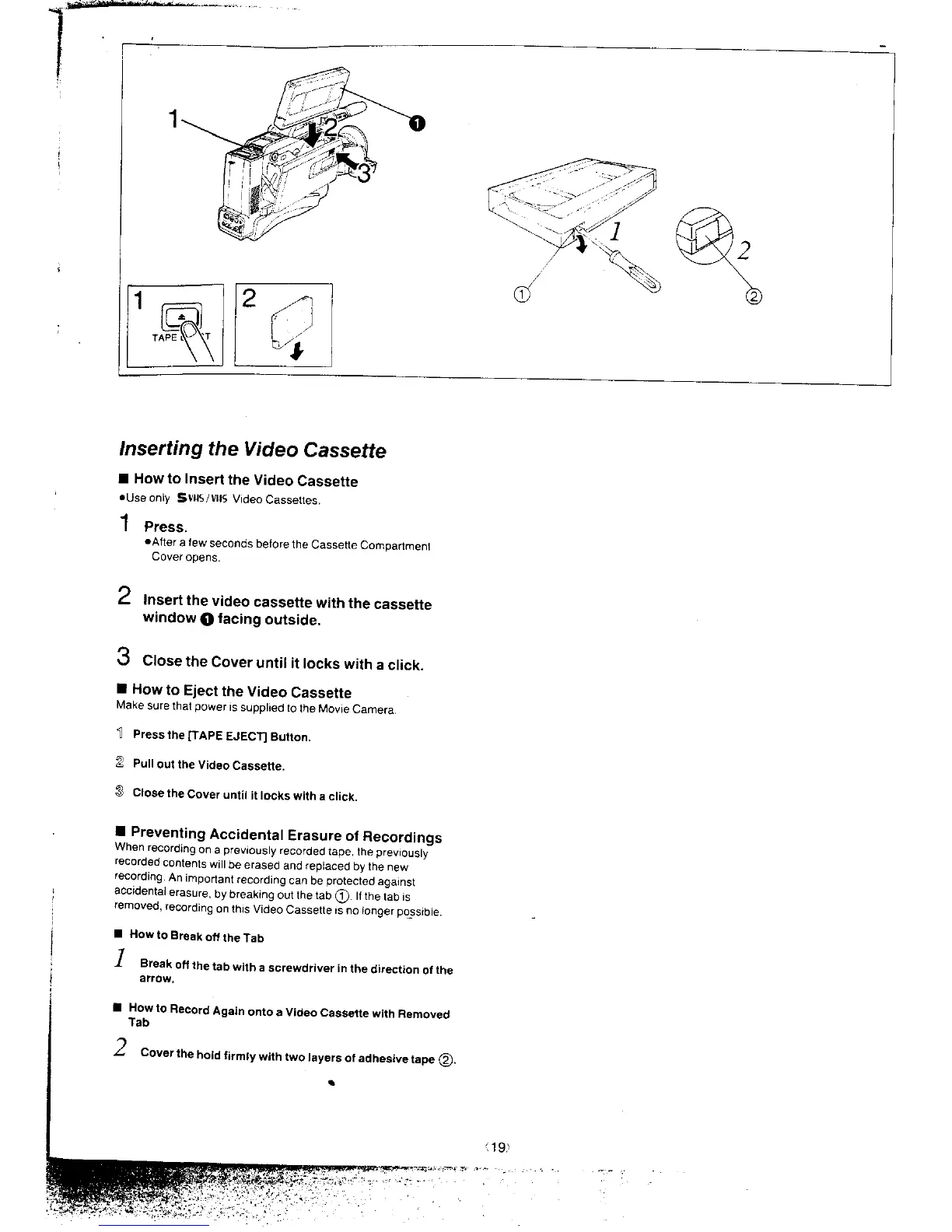 Panasonic NV-MS4A - Video Cassette Handling; How to Insert a Video Cassette; How to Eject a Video Cassette; Preventing Accidental Erasure