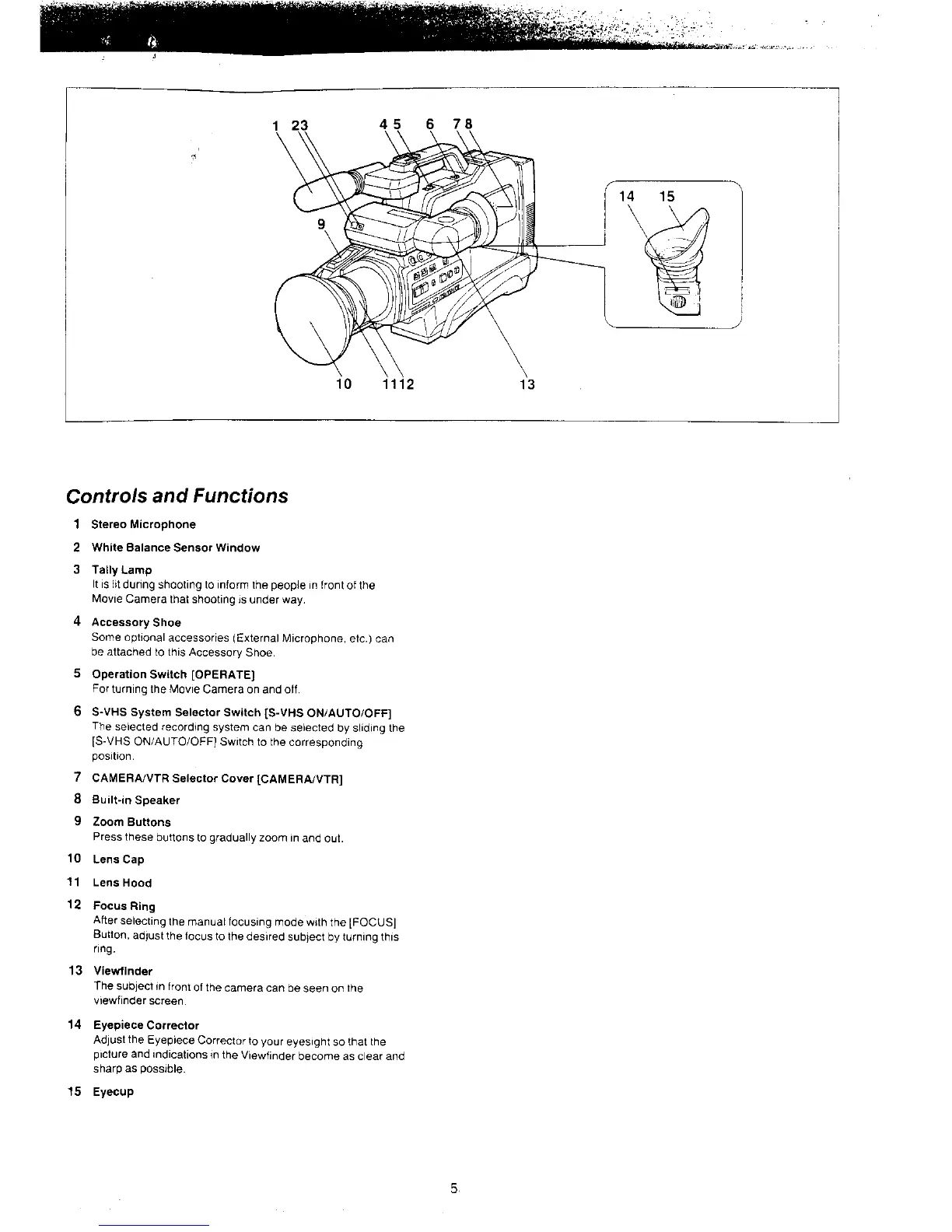 Panasonic NV-MS4A - Controls and Functions Overview; Microphone and Speaker Features; Operation and System Switches; Lens and Viewfinder Controls
