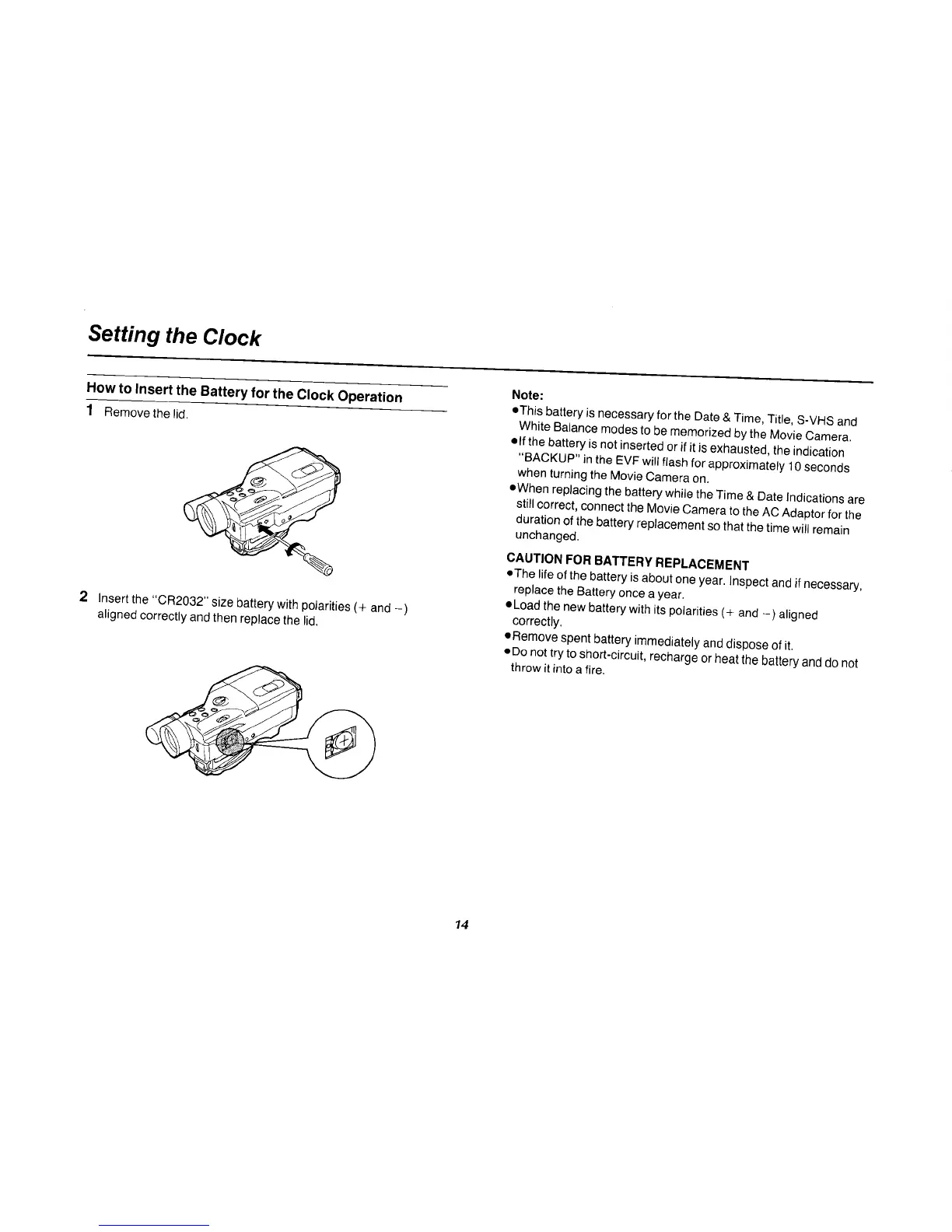 Panasonic NV-MS70B - Setting the Clock; How to Insert the Battery for the Clock Operation; Caution for Battery Replacement
