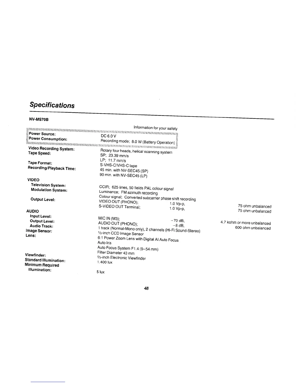 Panasonic NV-MS70B - Technical Specifications