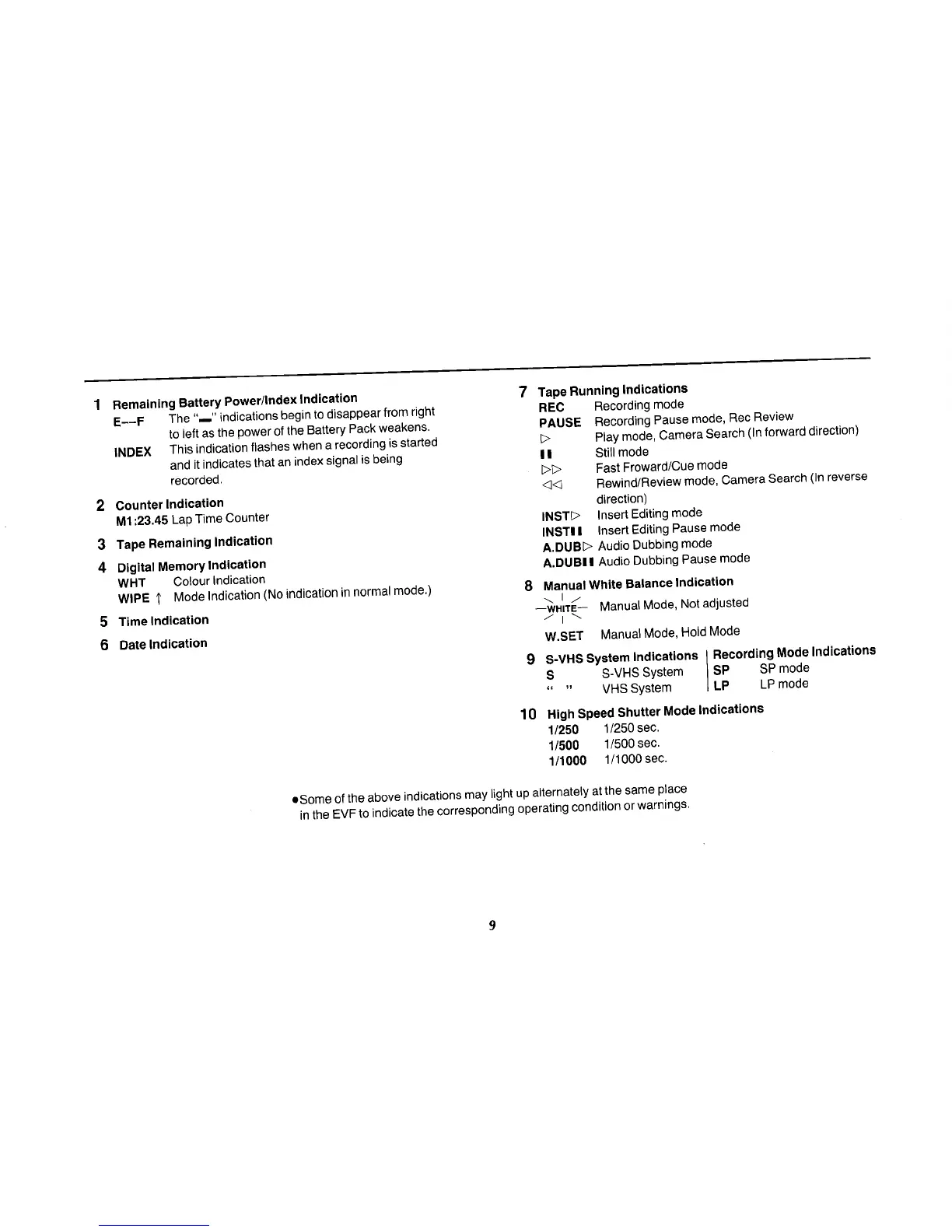 Panasonic NV-MS70B - Remaining Battery Power;Index Indication; Counter Indication; Tape Running Indications; High Speed Shutter Mode Indications