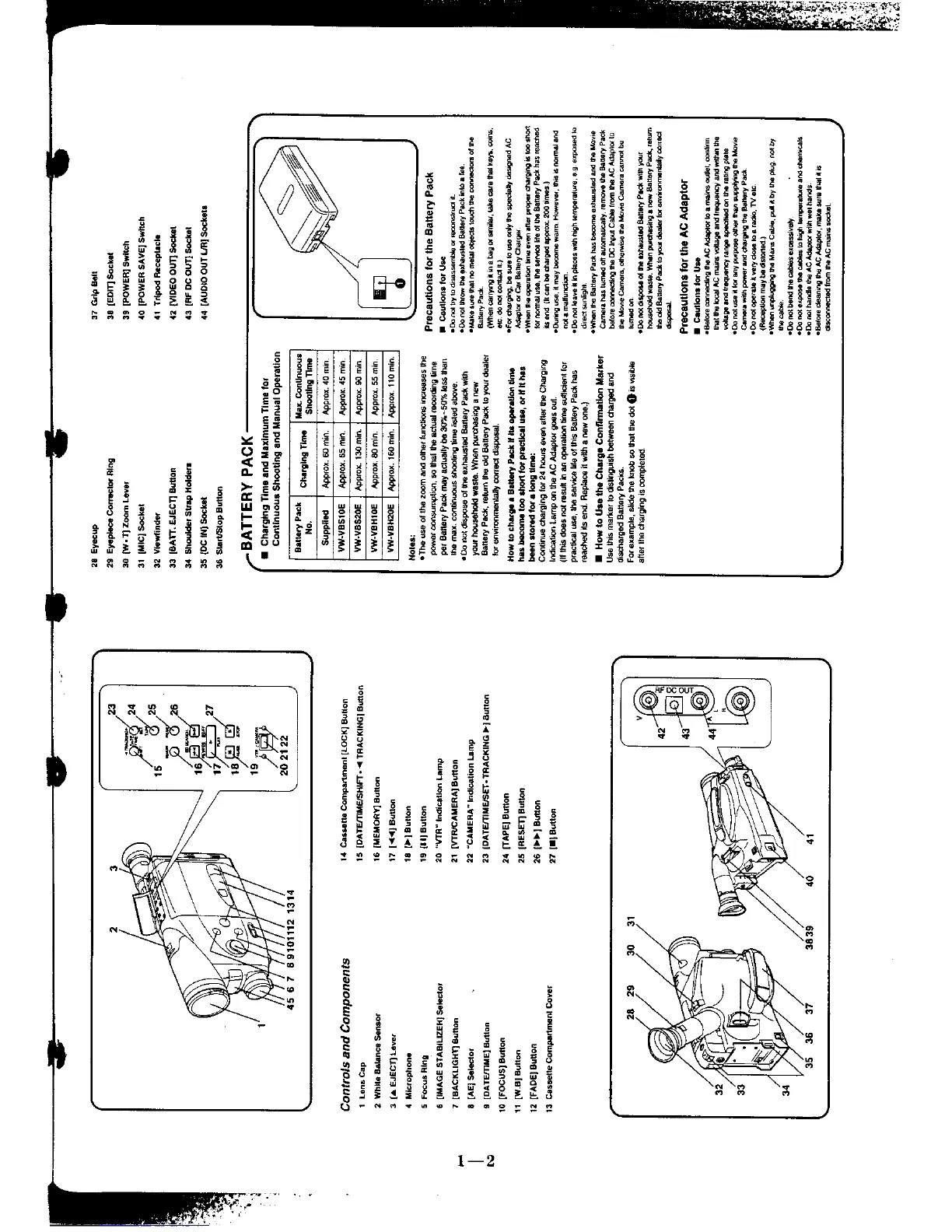 Panasonic NV-R33E - Controls and Components; Camera Controls Overview; Battery Pack Information; AC Adaptor Precautions