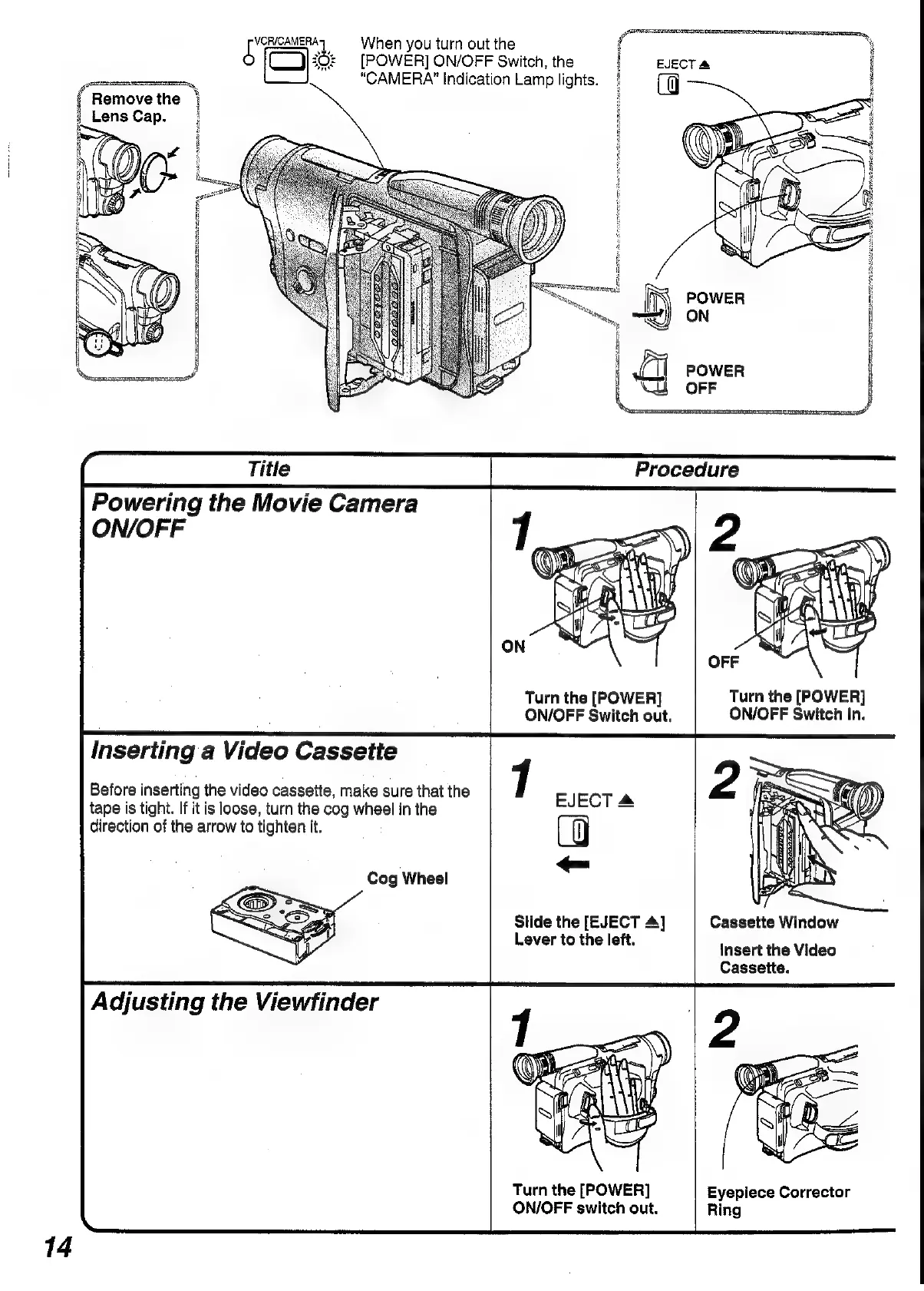 Panasonic NV-RX1A - Powering the Movie Camera ON;OFF; Inserting a Video Cassette; Adjusting the Viewfinder