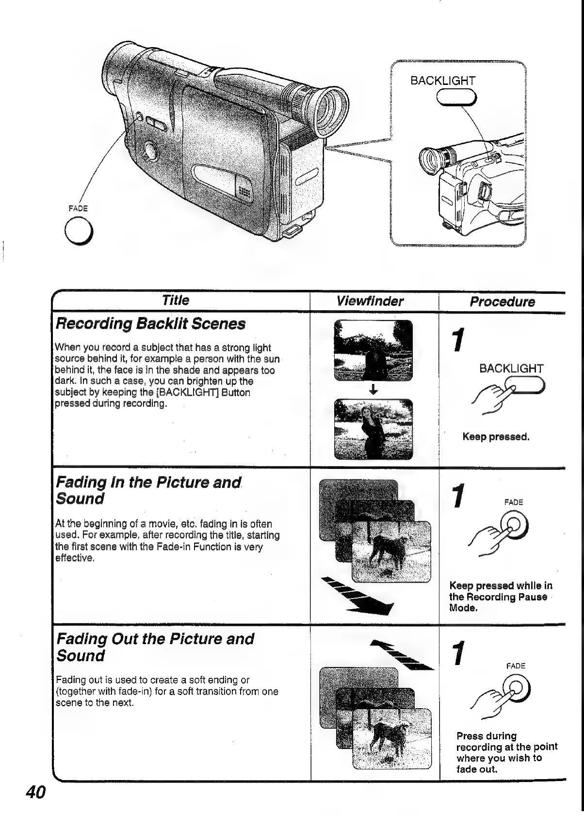 Panasonic NV-RX1A - Recording Backlit Scenes; Fading in the Picture and Sound; Fading out the Picture and Sound