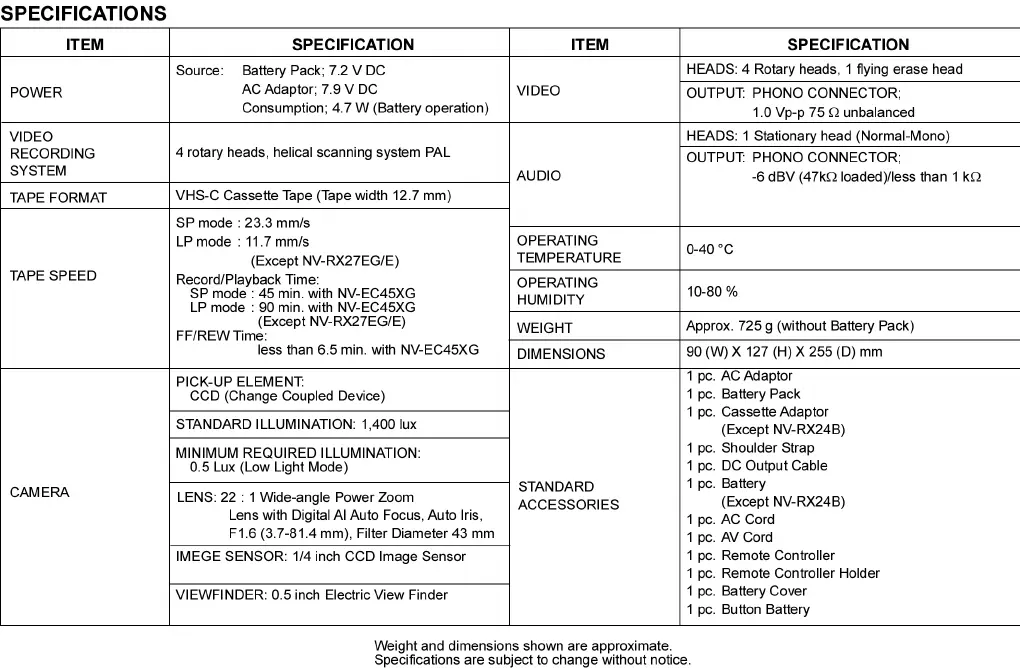Panasonic NV-RX27 - Product Specifications; System & Performance Specs; Camera & Operational Specs; Included Accessories