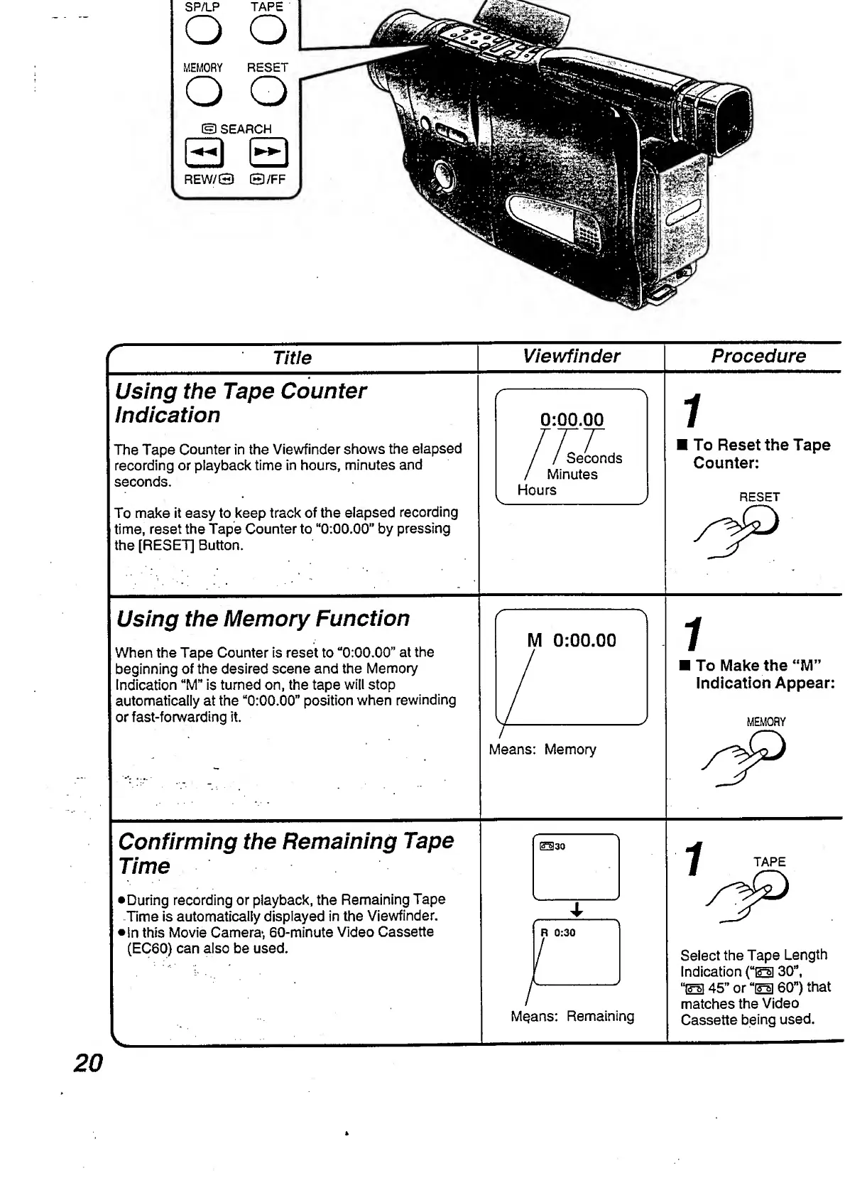 Panasonic NV-RX3A - Confirming the Remaining Tape Time; Using the Memory Function; Using the Tape Counter Indication