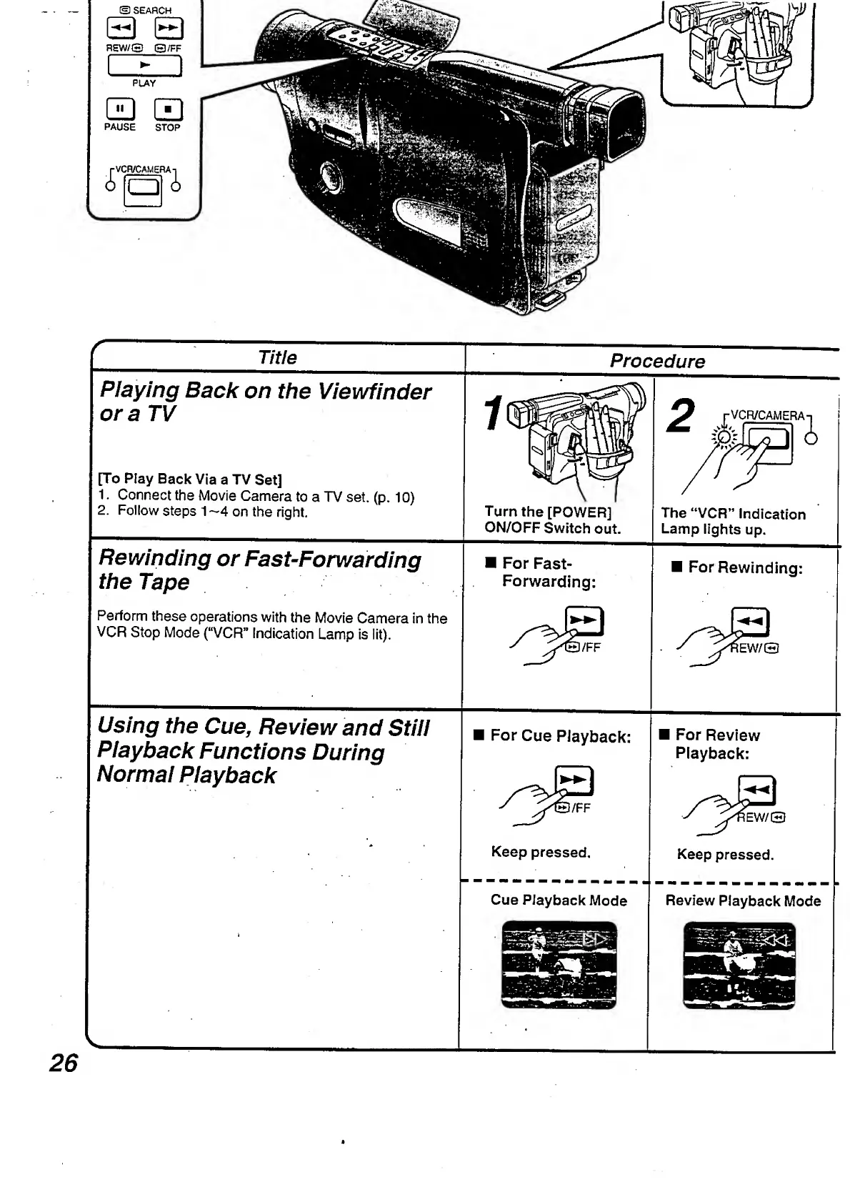 Panasonic NV-RX3A - Rewinding or Fast-Forwarding the Tape.26; Using the Cue, Review and Still Playback