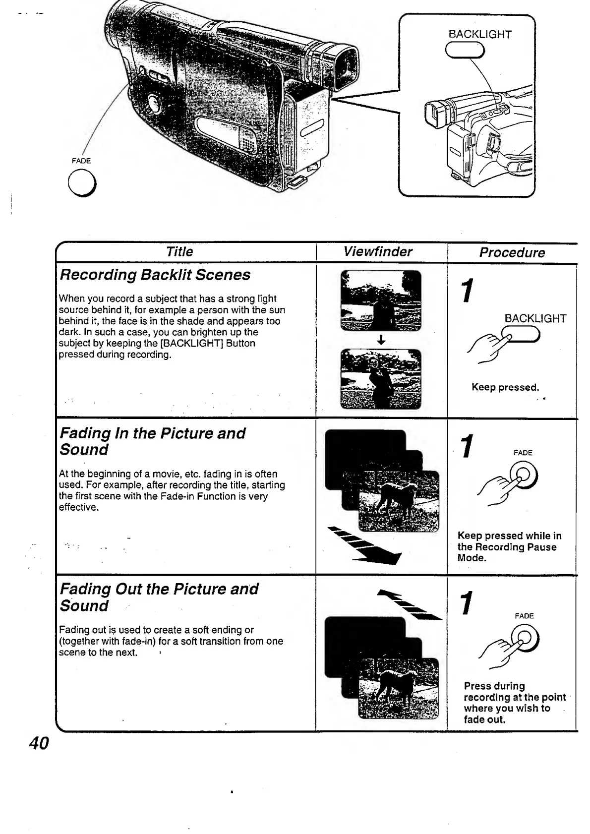 Panasonic NV-RX3A - Fading in the Picture and Sound; Fading out the Picture and Sound; Recording Backlit Scenes