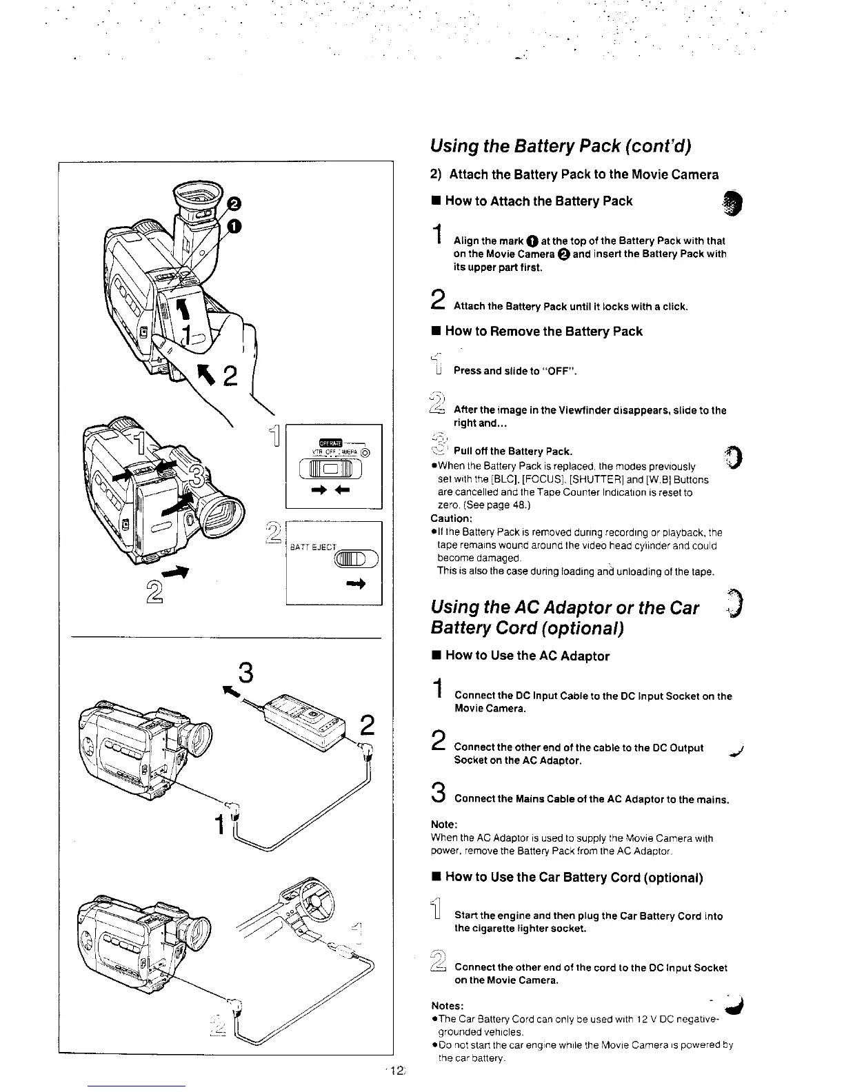 Panasonic NV-S8A - Using the AC Adaptor or the Car Battery Cord; How to Attach the Battery Pack; How to Remove the Battery Pack