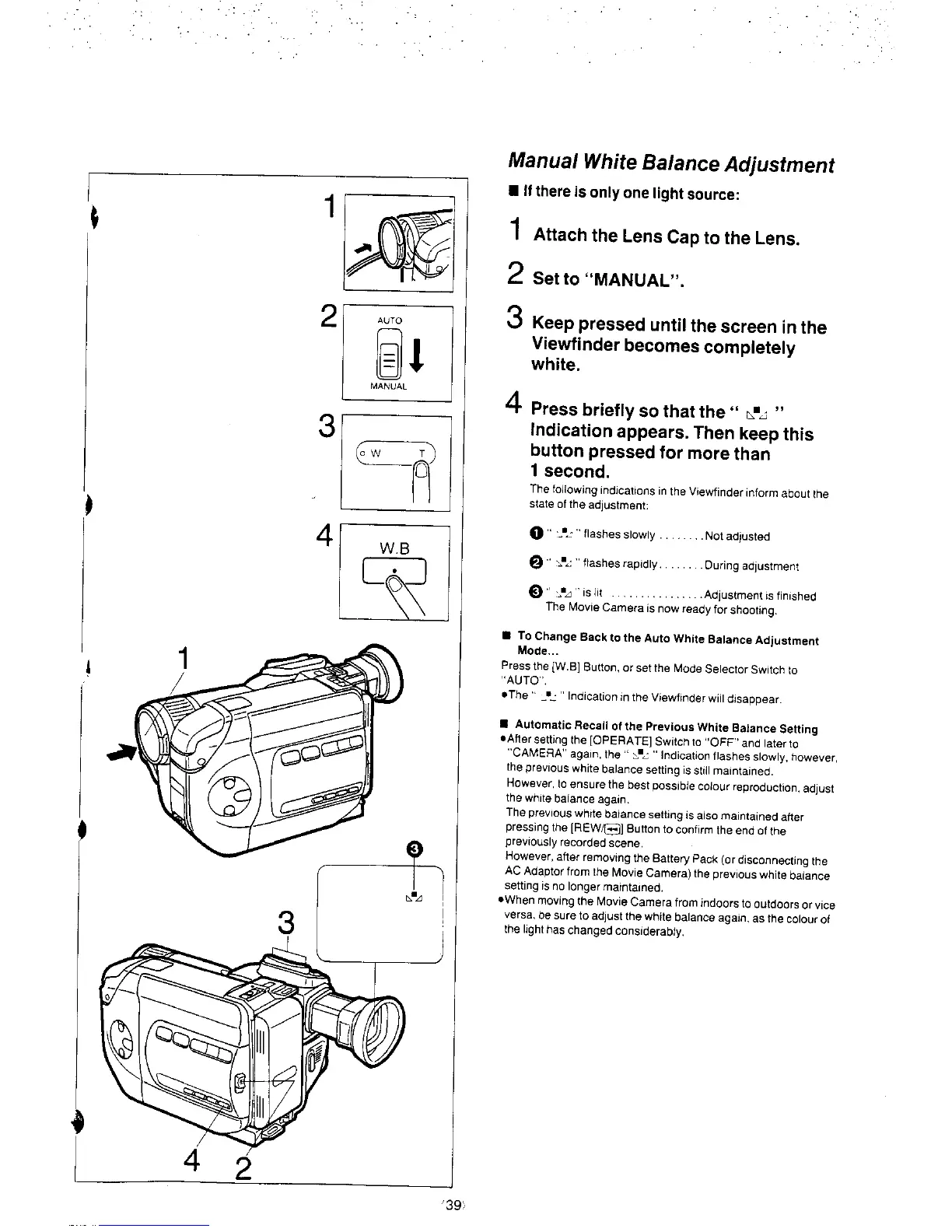 Panasonic NV-S8A - Manual White Balance Adjustment; To Change Back to the Auto White Balance Adjustment Mode; Automatic Recall of the Previous White Balance Setting