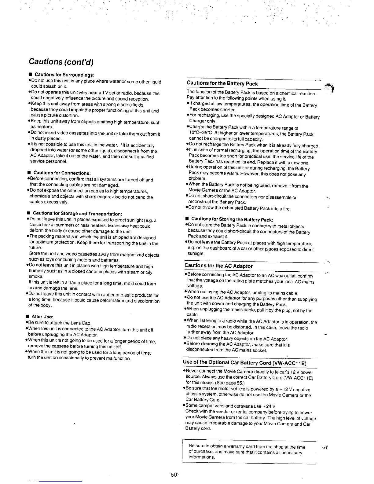 Panasonic NV-S8A - Cautions for the Battery Pack; Cautions for the AC Adaptor; Use of the Optional Car Battery Cord; Cautions for Surroundings