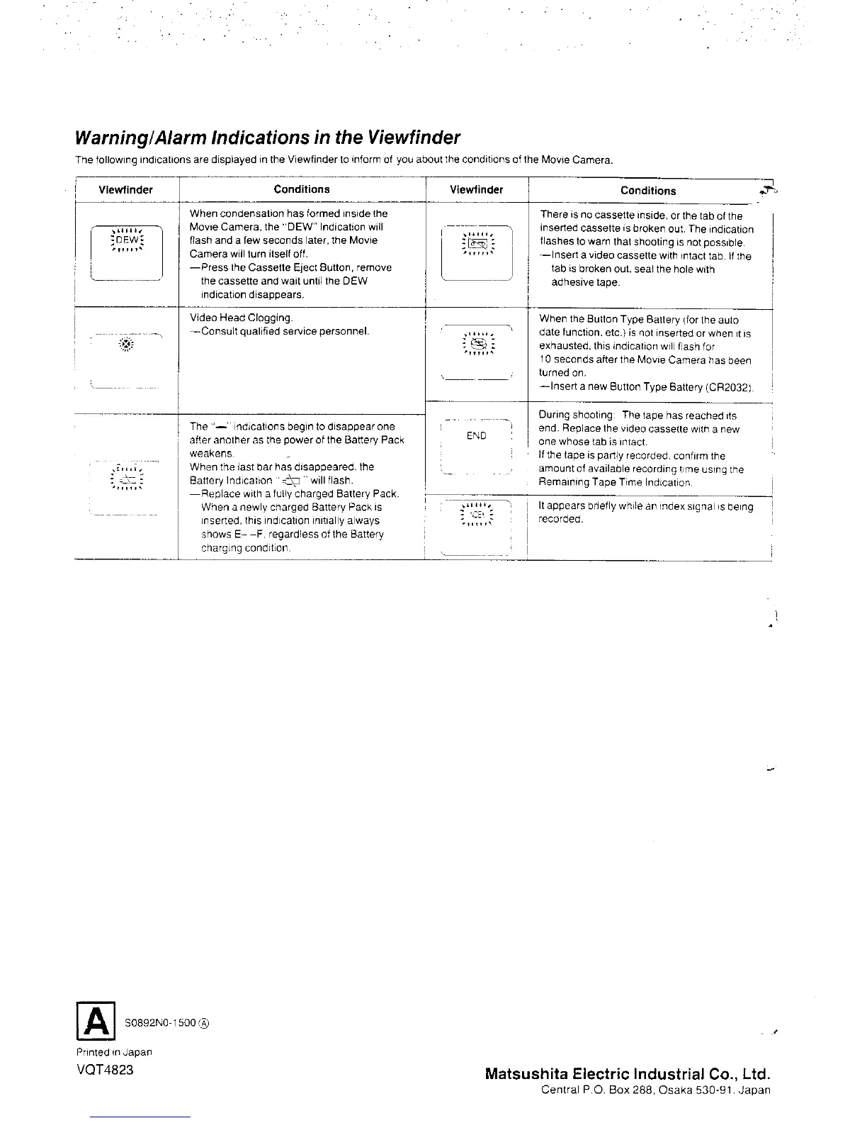 Panasonic NV-S8A - Warning;Alarm Indications in the Viewfinder