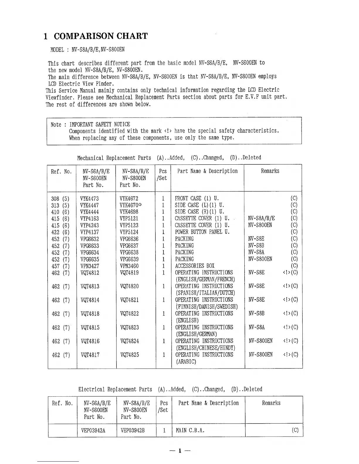 Panasonic NV-S8E - Comparison Chart