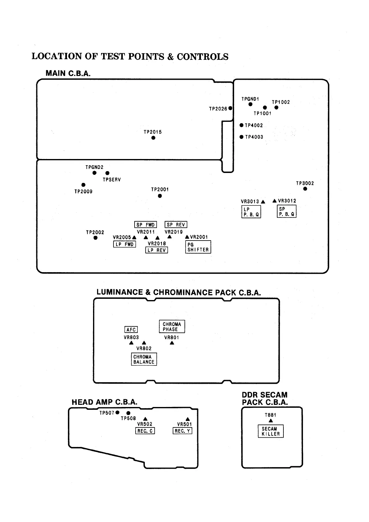 Panasonic NV-SD20EE - Location of Test Points & Controls; Main C.B.A.; Luminance & Chrominance Pack C.B.A.; Head Amp C.B.A.