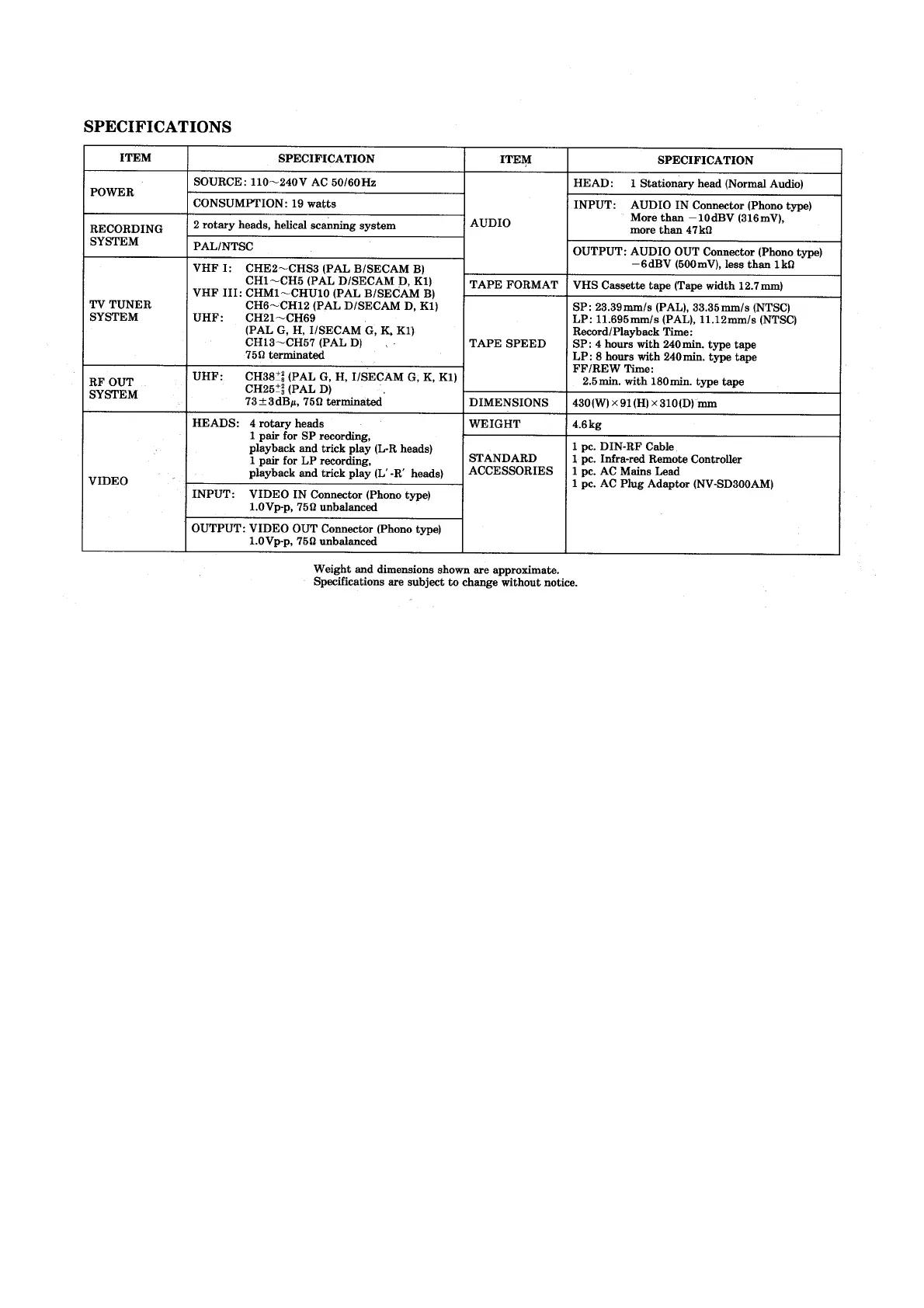 Panasonic NV-SD300AM - Specifications