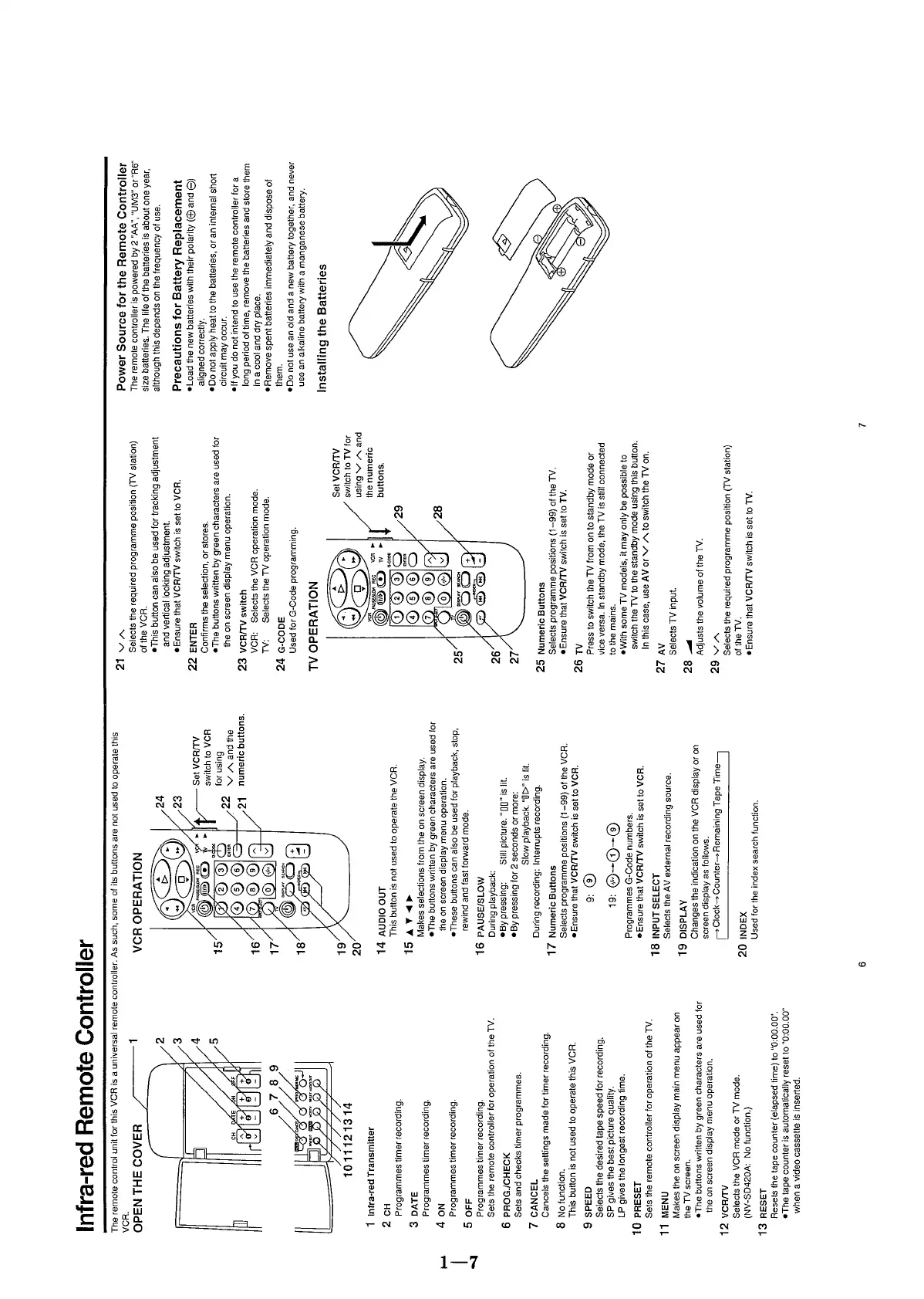 Panasonic NV-SD320 - Infra-Red Remote Controller; Open the Cover; VCR Operation; TV Operation