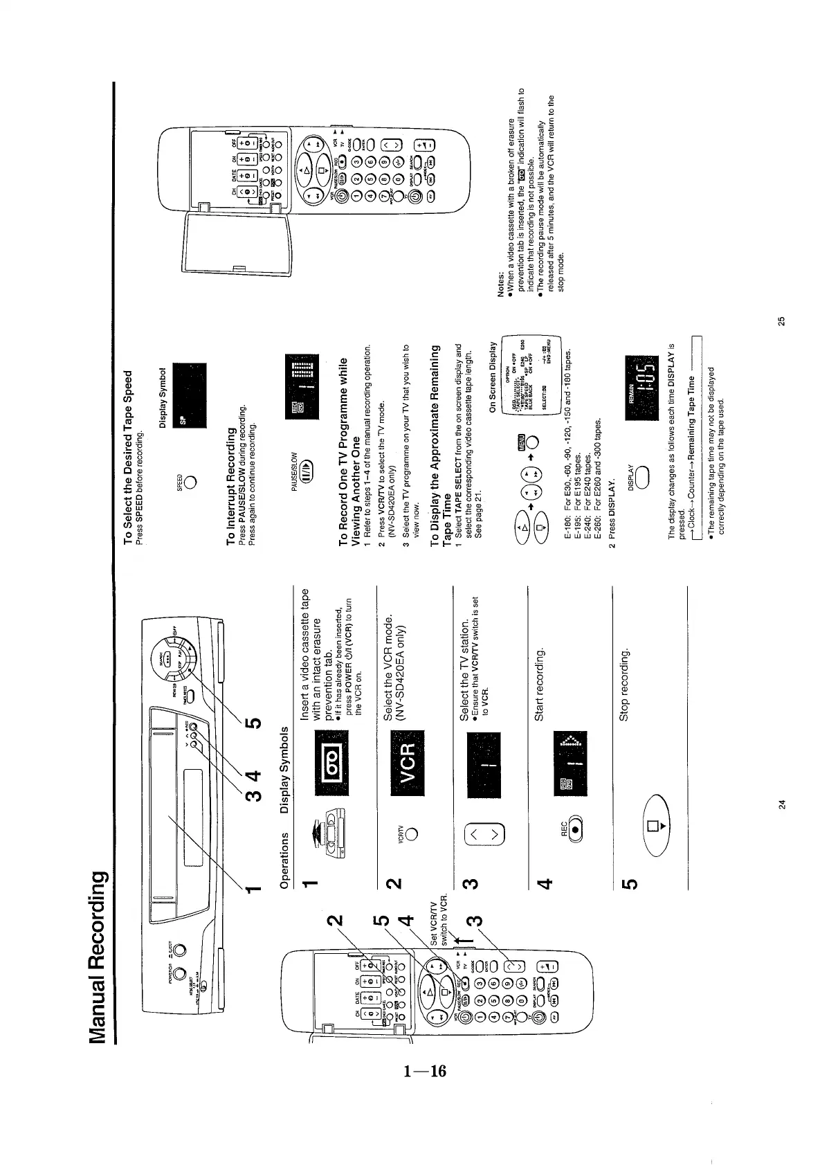 Panasonic NV-SD320 - Manual Recording; To Select the Desireed Tape Speed; To Record One TV Programme While Viewing Another One; To Display the Approximate Remaining Tape Time