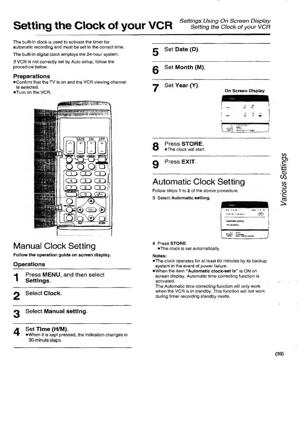 Panasonic NV-SD350 - Automatic Clock Setting; Manual Clock Setting