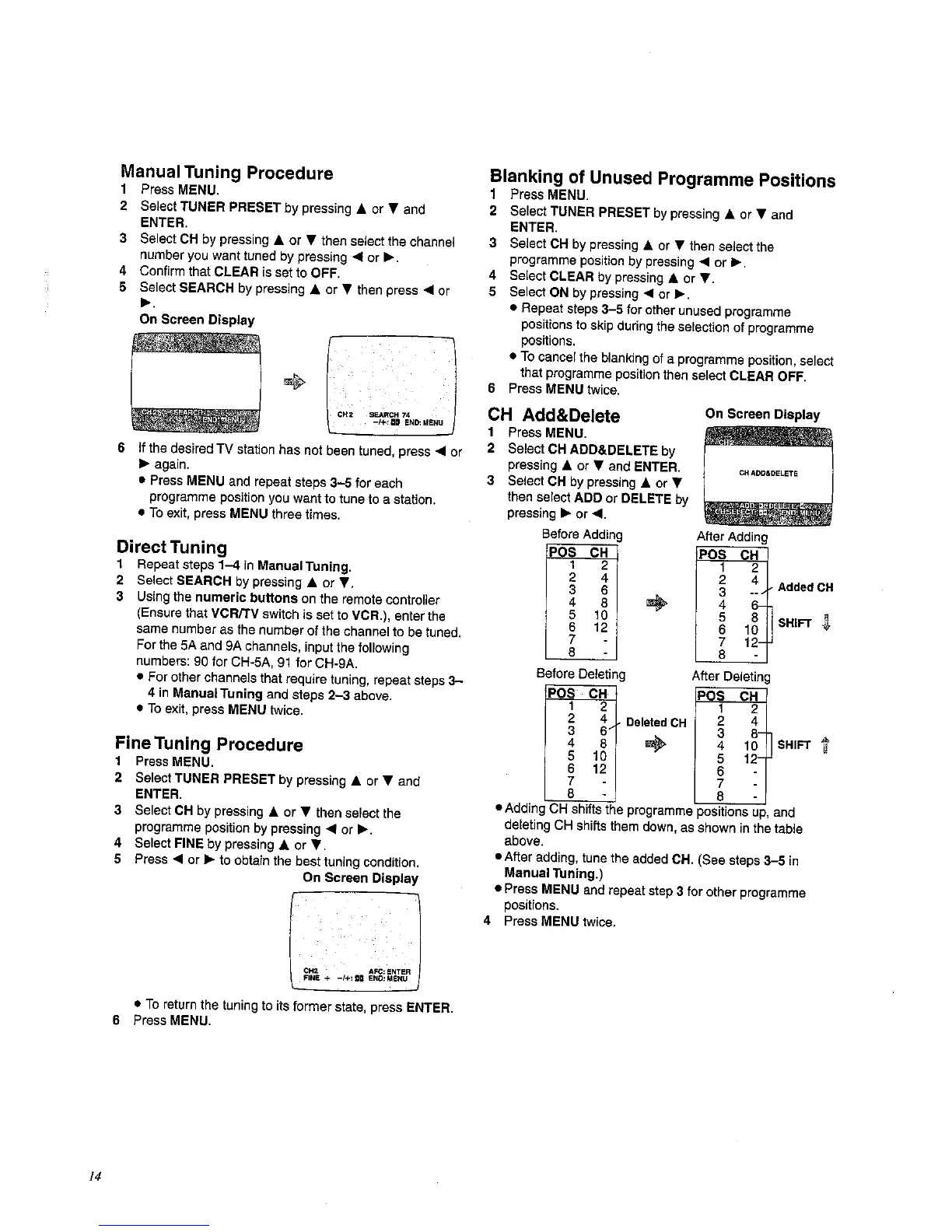 Panasonic NV-SD430 Series - Manual Tuning Procedure; Blanking Unused Programme Positions; CH Add & Delete; Fine Tuning Procedure