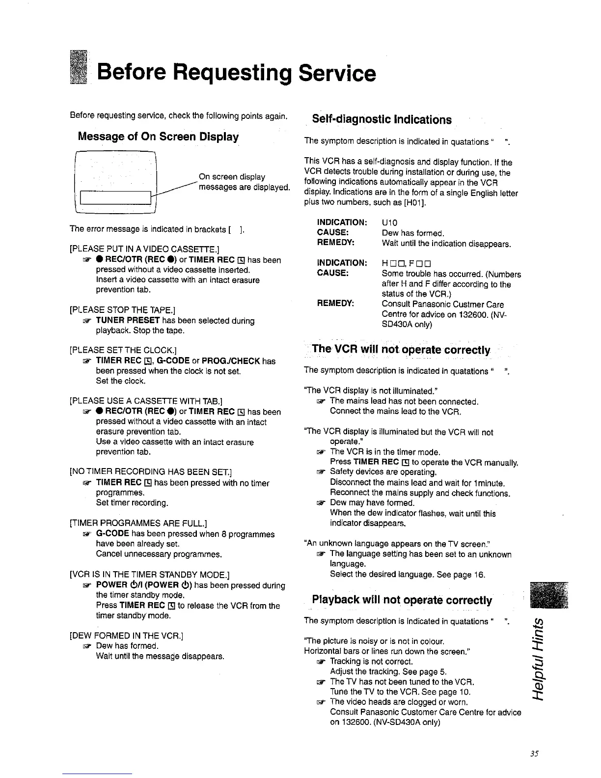 Panasonic NV-SD430 Series - Before Requesting Service; Message of On Screen Display; Self-diagnostic Indications; VCR Operation Issues