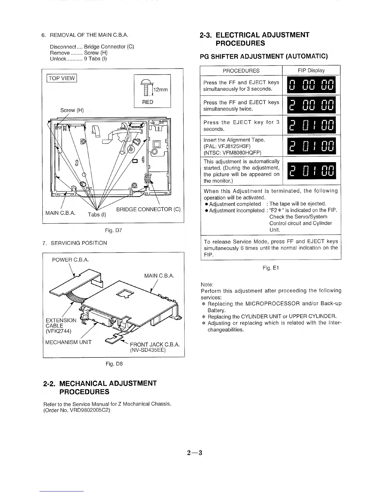 Panasonic NV-SD435EE - Electrical Adjustment Procedures; PG Shifter Adjustment; Removal of the Main C.B.A; Servicing Position