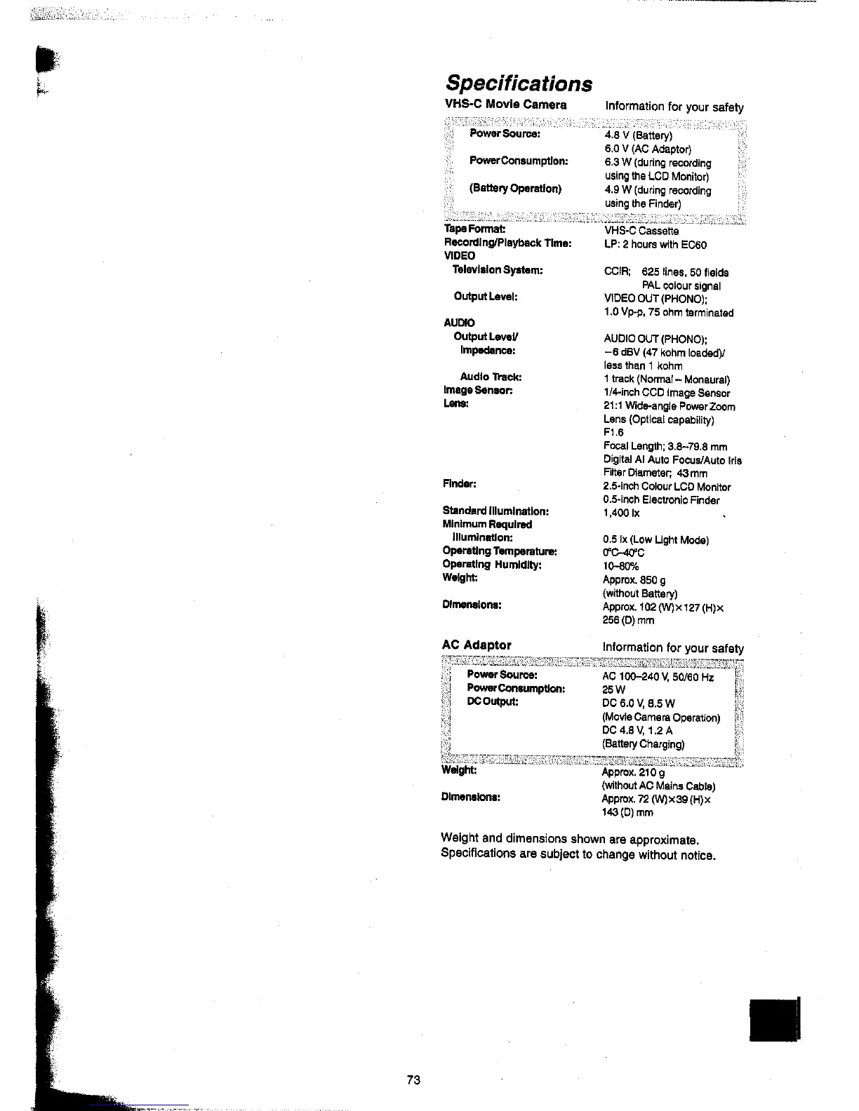 Panasonic NV-VX22A - Camera and Adaptor Technical Specifications