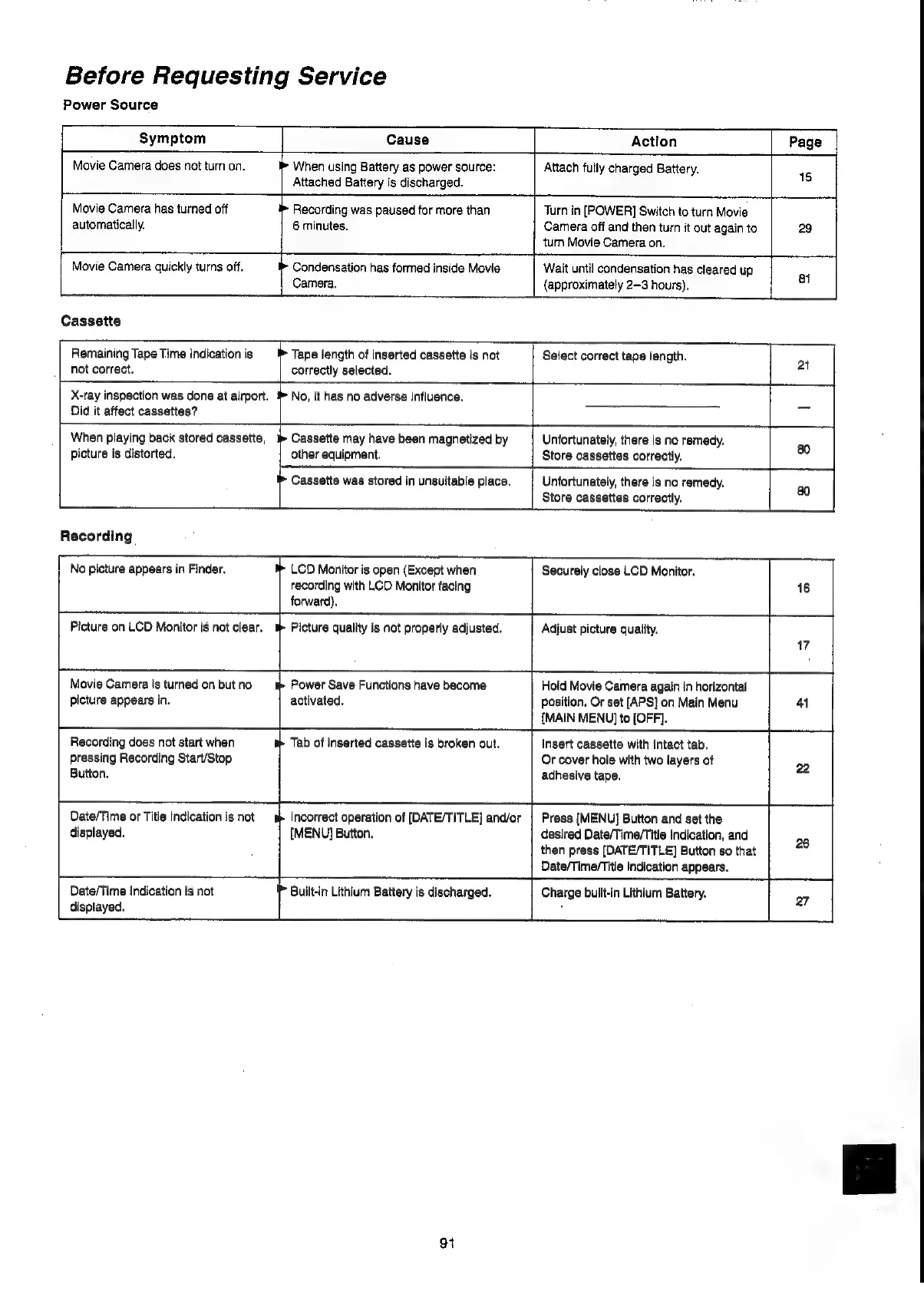 Panasonic NV-VX55A - Before Requesting Service; Power Source Symptoms; Cassette Symptoms; Recording Symptoms