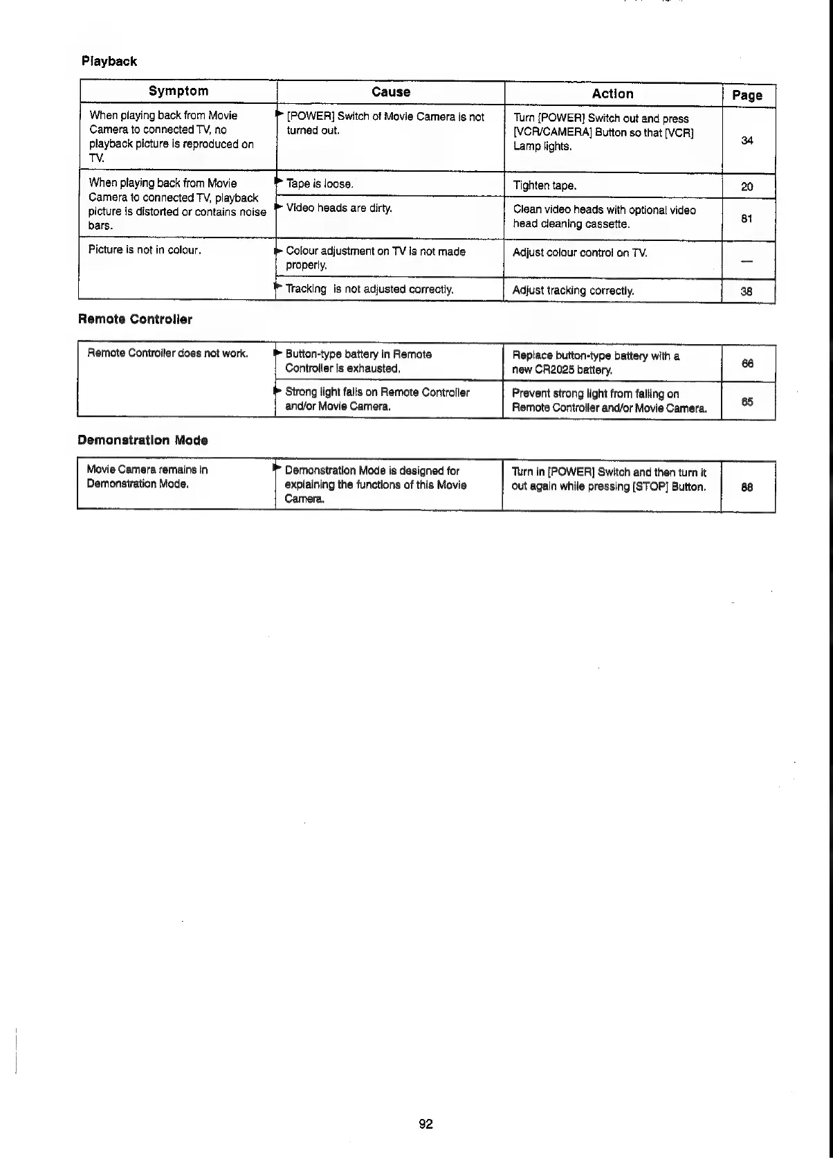 Panasonic NV-VX55A - Playback Symptoms; Remote Controller Symptoms; Demonstration Mode Issues