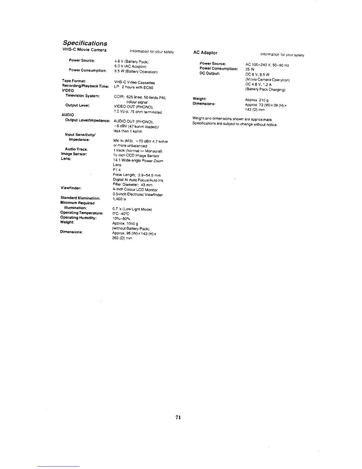 Panasonic NV-VX7 - Specifications