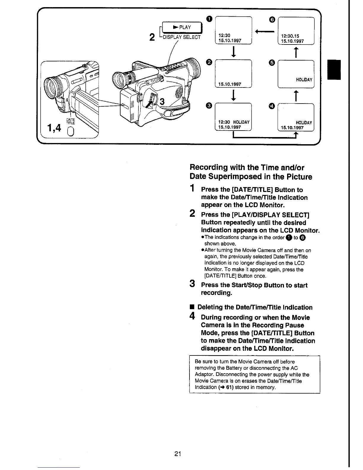 Panasonic NV-VX70A - Recording with the Time And;Or Date Superimposed in the Picture; Deleting the Date;Time;Title Indication
