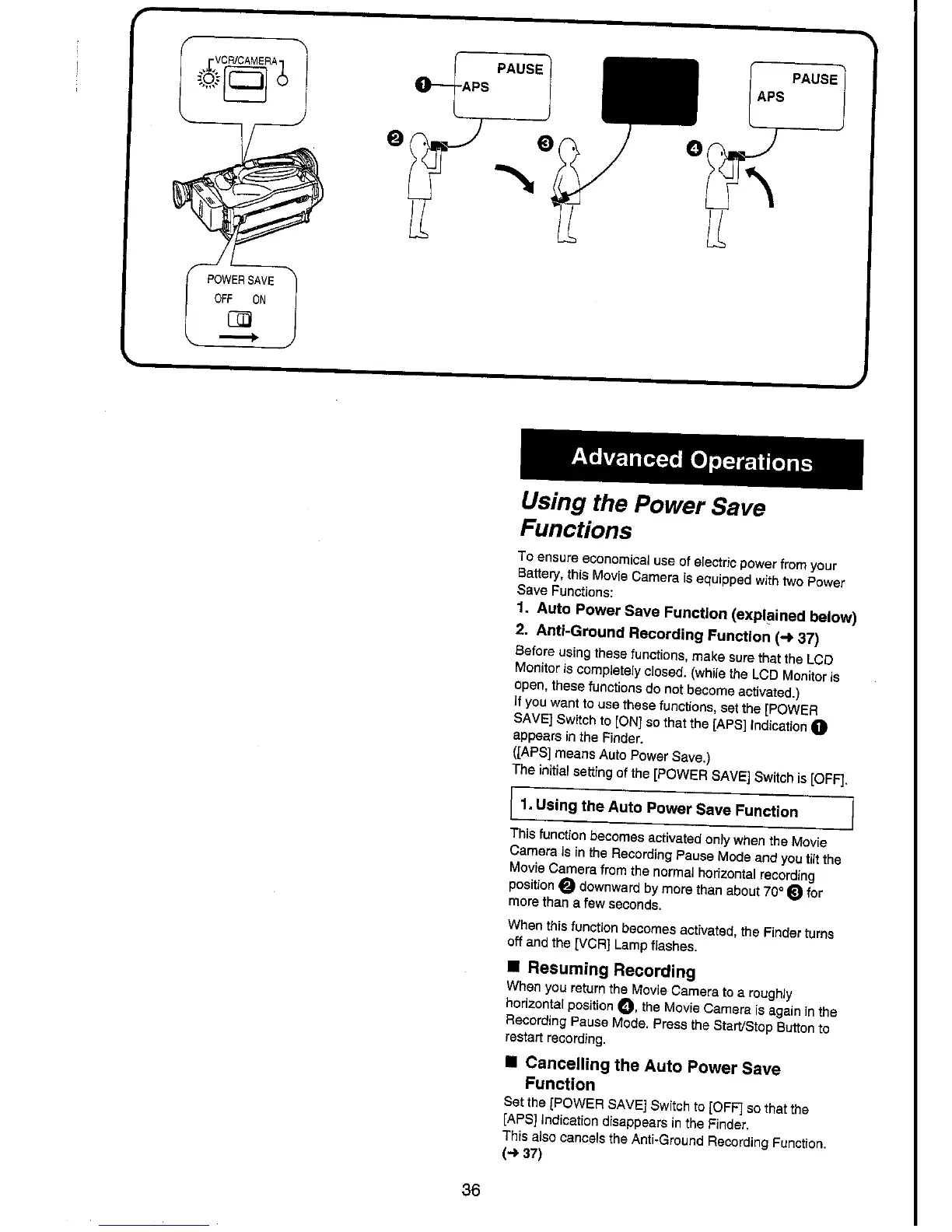Panasonic NV-VX70A - Advanced Operations; Using the Power Save Functions; Resuming Recording; Cancelling the Auto Power Save Function