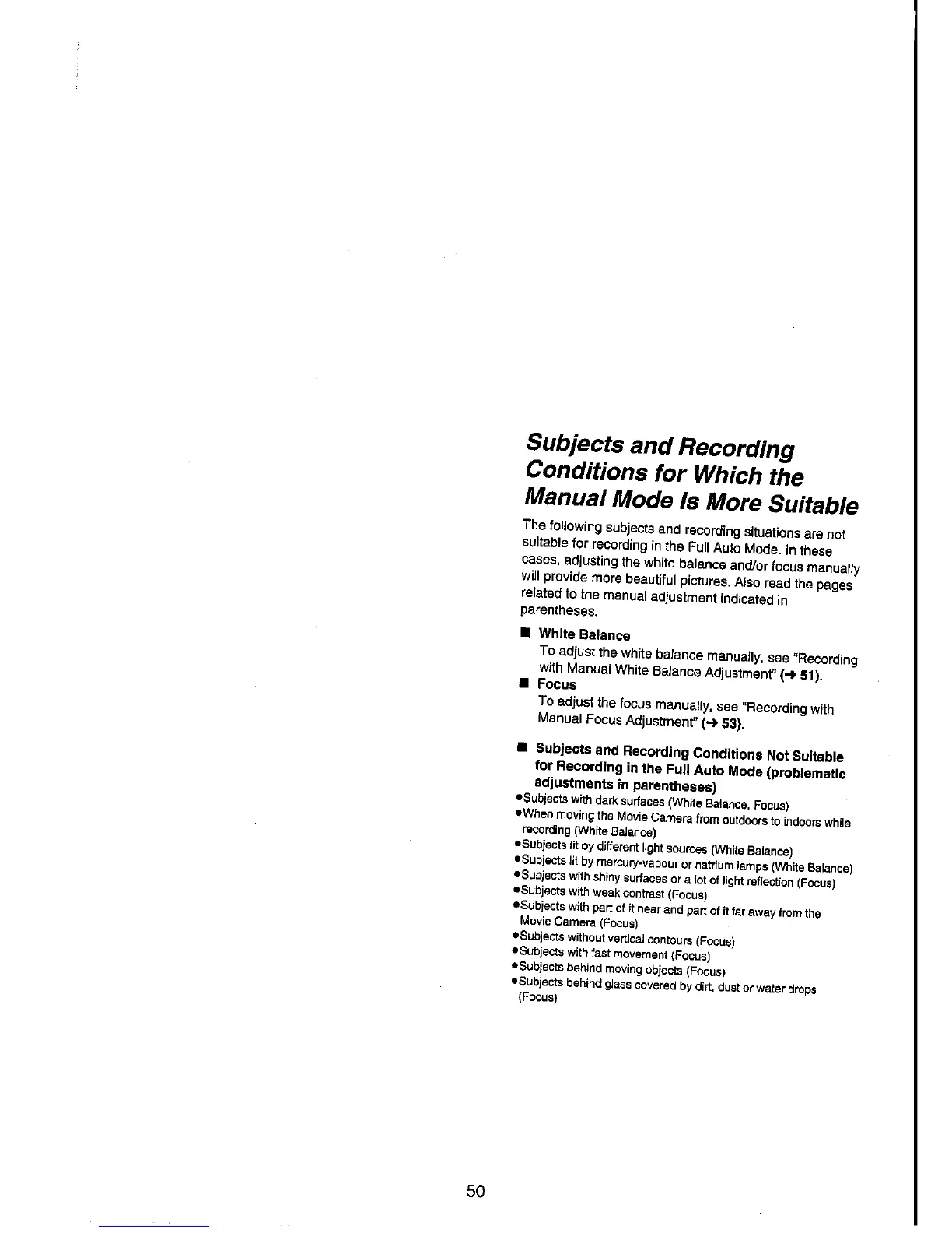 Panasonic NV-VX70A - Subjects and Recording Conditions; White Balance; Focus